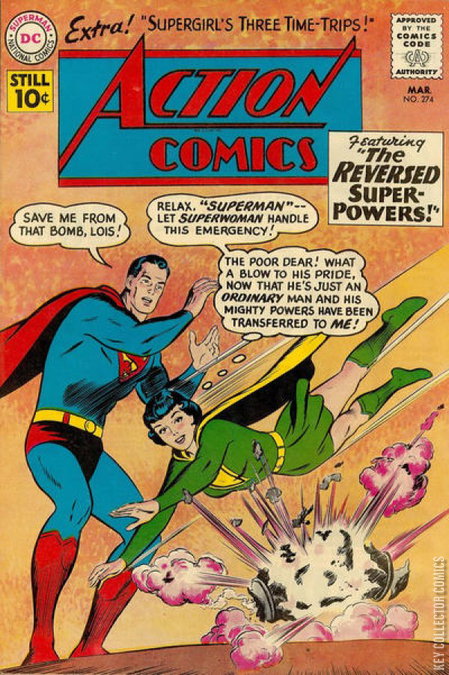 Superman - The Reversed Super-Powers!Have you ever felt sorry for Lois Lane because Superman, the mighty man she loves, won't marry her for fear his enemies would seek to hurt him by harming his bride? A hopeless situation, isn't it? But wait a minute! What if the situation were reversed, and it was Lois who has the super-powers?! A unique twist, isn't it, and it forms the basis for one of the most intriguing Superman stories of all time, with a shock ending you'll be talking about for months! It's the astounding, surprise-a-second tale of... The Reversed Super-Powers!Supergirl - Supergirl's Three Time Trips!Not only can Supergirl fly, but like her famed cousin, Superman, she has super-strength, super-breath and super-vision, in addition to other astonishing powers!... Also, she can...