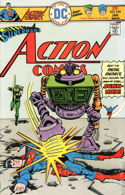 JUNKMAN - THE RECYCLED SUPERSTAR! A freak accident in Kandor transmits super-power to a junkpile robot, and Superman, the Atom, and Green Arrow must find a way to stop it before it destroys the bottle city.