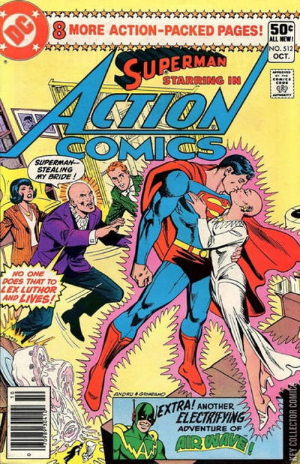LUTHOR'S DAY OF RECKONING! / SINISTER SPECTACLE OF SUNSPOTTER Lex Luthor marries Angela Blake, but it turns out to be part of a plot to trap Superman. Air Wave tangles with a solar-powered villain, Sunspotter.