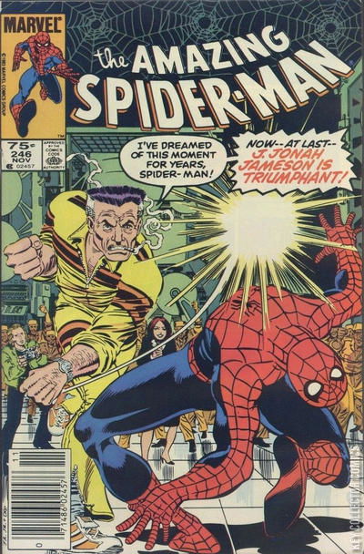 THE DAYDREAMERS! Uatu, the Watcher, tells that not only can he view alternate realities that exist in the multiverse, but the realities of thoughts and minds. He turns his attention to the planet Earth, where Felicia Hardy is still recovering in the hospital. She has grown bored and begins going against her doctor's orders to stretch and exercise. Her stretching is interrupted by the arrival of Spider-Man who has brought her Black Cat costume. Once she changes into her costume, the couple go out web-slinging. Spider-Man tells the Cat that their mission that evening will benefit from her skills as a former cat burglar. They are to recover papers from a foreign embassy for the sake of freedom. They easily steal the papers from an office when the wall-crawler lowers the Black Cat down from a skylight. They then go to the pier where they meet with their government informant on Spider-Man's yacht. They are paid a large sum of money for their services. As they speed off in their yacht, Spider-Man suggests that they go on vacation to Monaco. Along the way, the wall-crawler removes his mask, revealing that he is none other than film actor Cary Grant and they speed off into the sunset. Felicia Hardy suddenly snaps out of her daydream by a doctor who demands to know what she is doing out of bed. He tells her to get back to bed before she pops her stitches. Felicia follows orders and thinks about her little dream. She realizes that Spider-Man is probably not Cary Grant, but thinks about how wonderful it would be if he did. Meanwhile, at the offices of the Daily Bugle, publisher J. Jonah Jameson arrives at the office wearing a tracksuit. He is handed a copy of the late edition of the Daily Bugle. The front page story is about Spider-Man saving the day and this frustrates him. Suddenly, Spider-Man comes down from the ceiling and mocks Jameson. This angers the publisher and he rips the newspaper in half in frustration. Having had enough of the wall-crawler, Jonah takes a swing at the masked hero, stunning him. The publisher begins beating down on the web-slinger and forces him to confess that he is a menace to society. Jameson's battle gathers a crowd, including Peter Parker and Lance Bannon snap photos while cheering Jameson on. Once he finishes cleaning the wall-crawler's clock, he is joined by his girlfriend Marla Madison who runs to his side. A now noticeably youthful Jameson is given the reprinted late edition which proclaims that he defeated Spider-Man and has been named publisher of the year. However, this too is a daydream. Jameson wishes that this could be the case, but concedes that the Daily Bugle will only publish facts. He is satisfied with writing his editorials in the hopes he will eventually crush his nemesis in the court of public opinion. Elsewhere, Mary Jane Watson is leaving the Shubert Theater with a date to go get some food. Mary Jane tells her date how she's always wanted to perform on Broadway and how sitting in the front row is almost as though she is part of the show. Looking up at the marquee she is shocked that the show coming soon is called the "Mary Jane Watson Story". When the gathered crowd spots Mary Jane, they swarm her asking for an autograph. Getting past her adoring fans, Mary Jane goes into the theater where a blonde woman is being denied the part of Mary Jane in the play. Seeing Mary Jane, the director suggests that they hire her to play herself. This is met with praise from actors Warren Beatty and Woody Allan who are playing the roles of Spider-Man and Peter Parker respectively. They cheer her on as she recites lines from the play, but the accolades are interrupted by Mary Jane's sister Gayle and her two children. Gayle asks Mary Jane if there is a role for her in the play about her life story. The appearance of her sister snaps Mary Jane out of her daydream. Her date is concerned about her, but Mary Jane assures him that her mind wandered. Meanwhile, Spider-Man is not far from Avengers Mansion, pondering if he should accept an offer to join the Avengers or not. He then spots J. Jonah Jameson jogging down the street and wonders why he is on a health kick as of late. Suddenly, an army of super-villains break out of the ground and surrounds the publisher. Spider-Man tosses out a highly advanced camera to snap photos as he goes to aid Jameson. As Spider-Man fights off this nearly endless army of villains, Jameson suddenly realizes that Spider-Man is a hero. Once the battle is over, Jonah gets down on his knees and kisses Spider-Man's feet in thanks for saving his life. This becomes the photo on the front page of the Daily Bugle, with the headline "Jameson Eats Crow". This very shot wins Peter Parker a Pulitzer Prize for photojournalism. Suddenly, the award ceremony is interrupted by Morris Sloan, who tells Peter that some of his lab work at Empire State University turned out to be a cure for every illness in the world. Swarmed by reporters, Peter slips away to change into Spider-Man to get away. He goes to Central Park where the Avengers and Fantastic Four are joining the mayor of New York to award Spider-Man a key to the city. Suddenly, the two superhero teams fight over which group Spider-Man gets to join. Spider-Man tells them that he will work for both teams on alternating days. However, this dream is shattered when Captain America points out the reflection of Spider-Man on his shield. It is that of Peter Parker, someone they say doesn't look like a hero an abandon them. Spider-Man is snapped out of his daydream by the shouts of some teenagers bullying a skinny young man. Spider-Man scares the bullies off and helps the kid pick his books off the ground. The wall-crawler encourages the child not to let the bullies get him down and to focus on his studies, but also not to forget about the outside world. The boy is in awe as Spider-Man web-slings away. The teen imagines what it would be like to be a hero just like Spider-Man, however, he dismisses this idea as ri