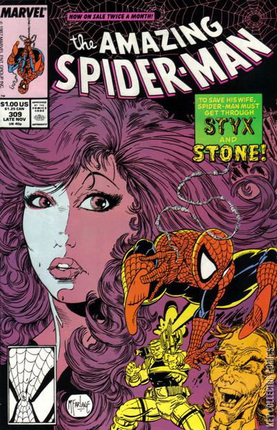 STYX AND STONE Spider-Man's wife Mary Jane has gone missing and the hero is tearing up criminal operations in order to find her. In the Bronx, the wall-crawler attacks Manslaughter Marsdale at Hunzigger's Gym. He knocks Marsdale to the ground with a single blow and webs the crooked boxer up so he can answer his questions. Marsdale tells the wall-crawler to do his worst, as he has had an operation that made him incapable of feeling pain. Spider-Man threatens to rip his arm off anyway, but Marsdale tells the hero that he can't tell what he doesn't know. Hearing this, Spider-Man leaves without another word. Pulling himself off the ground, Manslaughter decides to tell his associate Madame Fang to spread the word on the street. By evening, Spider-Man is perched atop a building wondering where things went wrong. Things were going great for him and Mary Jane, but she suddenly went missing and he hasn't been able to find a single clue as to her whereabouts. Feeling useless, the wall-crawler angrily punches a stone gargoyle. Giving up for the night, Spider-Man returns home and hopes that his wife is still alive. He's unaware that Mary Jane is being held prisoner by Jonathan Caeser, the man who owns Bedford Towers. In the specially made room where he is keeping her prisoner, directly below her home, Mary Jane is forced to have dinner with Caeser. The deranged man goes over his goes over his insane plan to get married to Mary Jane. She tries to reason with him, explaining that she already married. When he begins talking about consummating their "marriage" in the bedroom he constructed for them, Mary Jane throws ice from a champagne bucket in Jonathan's face and tries to make a run for it. When she tries to escape from the room, she runs into Jonathan's bodyguards. Caeser is furious and pulls out a switchblade and warns Mary Jane that he will use it if she tries to escape again. The two guards warn Jonathan that Spider-Man has been hunting for Mary Jane. Caeser finds this interesting and decides to call in some special bodyguards to deal with the masked hero. The next morning, Peter Parker is at the Daily Bugle, where he tells Glory Grant that there is no news on where Mary Jane might be. When J. Jonah Jameson enters the room, he wants to know why Peter is in his office bothering his full-time employee. Once Peter leaves, Jameson orders his staff to put all their efforts in trying to find Mary Jane. When Glory Grant comments about Jameson caring, he scoffs at the idea, saying that it will sell more newspapers. Peter decides that he should go and visit his Aunt May and break the news to her. However, he makes a stop at the hospital to see how Joe Robertson is coming along while he recovers from injuries inflicted upon him by Tombstone. After Joe hears how Jameson has been running the Bugle in his absence, Joe remarks that he feels helpless. Meanwhile, in the secret room in Bedford Towers where Mary Jane is being held prisoner, the men that were hired by Jonathan Caeser arrive. They are two mercenaries for hire named Styx and Stone. Mary Jane begins to fear for her husband's safety when she witnesses Styx touches a plant with his bare hands, killing it instantly. Later that evening, Spider-Man has spent yet another fruitless search for his missing wife. His approach to Bedford Towers is witnessed by Caeser and Mary Jane. Jonathan orders Styx and Stone to attack. Although they try to ambush the wall-crawler, Spider-Man's spider-sense warns him of the approaching danger, evading a chain fired at him by Stone. Seeking a location where innocent people cannot get hurt, Spider-Man lures his foes into Central Park. Because Spider-Man is capable of dodging all of the various weapons in Stone's shoulder cannons, the villain blinds Spider-Man with a bright flash of light. Back at Bedford Towers, Mary Jane attempts to incapacitate Jonathan by electrocution by tossing a broken lamp on a puddle of melted ice cubes that her captor is standing in. This doesn't work thanks to fact that Jonathan is grounded by the rubber soles of his shoes. When Caeser pulls out a switchblade, Mary Jane smashes the lamp across his face, knocking him out. When Caeser's goons enter the room, Mary Jane notes that they are wearing leather shoes. This makes them vulnerable to the electricity in the lamp, and she incapacitates them in the same way she planned to do to Jonathan. She then takes one of their guns and flees the room she has been held captive in. Back in Central Park, the blinded wall-crawler is still able to dodge the blasts fired by Stone. Unfortunately, the villain eventually traps Spider-Man in some adhesive gel. This leaves Spider-Man vulnerable to the deadly touch of Styx. However, before he can eliminate their foe, Mary Jane arrives and opens fire on them. Spider-Man then reaches out and crushes Stone's shoulder cannons. With bullets flying in their direction, the two villains escape in their Turbo-Hopper and flee the park. Pulling his feet free from the adhesive, Spider-Man and Mary Jane are reunited. With his vision coming back and with police on their way, Spider-Man takes off to change back into Peter Parker. When he returns home, it's just as Jonathan Caeser is being taken into police custody. After giving a statement to Sargent Tork, Peter and Mary Jane head back to their condo. When Peter laments that he couldn't protect his wife, Mary Jane points out that Jonathan Caeser would have kidnapped her even if her husband wasn't secretly Spider-Man. She then tells him that they have to help and protect each other together, as that is what being in love is all about.