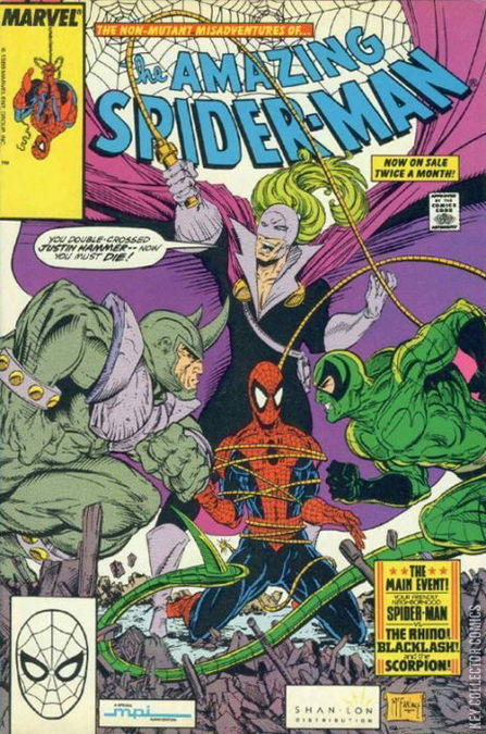 THE SCORPION'S TAIL OF WOE! Hired by Justin Hammer to kidnap General Chester Musgrave, the Scorpion has instead decided to hold Musgrave hostage in exchange for J. Jonah Jameson. Unable to risk the life of Musgrave, Spider-Man finds himself reduced to picking up a pizza for his foe when he becomes hungry while waiting for Jameson to arrive. Although the Scorpion mocks Spider-Man for being unwilling to let innocent people to get harmed, so Spider-Man made sure that the pizza had anchovies, much to the Scorpion's disgust. When Spider-Man checks to see how things are developing, the Colonel in charge informs him that J. Jonah Jameson is not cooperating with them. When Spider-Man considers asking the Scorpion to give them an extension, the villain informs them that their time is up and begins shooting wildly with his tail blaster in order to cover his escape. When the Scorpion tries to retreat in a helicopter waiting to pick him up, Spider-Man tries to hitch a ride with a web line. However, the Scorpion sees this and cuts Spider-Man loose. Shooting another line onto the Scorpion's tail, Spider-Man swings up and secretly tags his enemy with a spider-tracer. When his web line is cut by the helicopter's rotor blade, Spider-Man to make a dive into the East River. Later, at the mansion of Justin Hammer, the wealthy inventor learns about how the Scorpion reneged on his deal. Deciding to make an example out of the villain, he goes over his list of operatives in order to find someone suitable to go after him. Meanwhile, in Forest Hills, Spider-Man returns to his Aunt May's home where he has been staying. He learns from his Aunt that his wife Mary Jane is still out on a modeling shoot. However, in reality, Mary Jane is once more dancing her worries away after being sent home from another modeling assignment. She is pulled off the dance floor by her friend Sandy Kitzler, who shockingly tells Mary Jane that she won't be getting another modeling gig ever again. Meanwhile, in Soho, Harry Osborn takes his wife Liz to the loft building that he recently uncovered. He explains to his wife that with the damage done to an Osborn Chemicals plant uptown he has decided to move his family here so he doesn't have to commute from New Jersey to oversee repairs. However, Liz is worried because she sees a Green Goblin mask among the boxes of items in the room. When he brings this up, Harry assures her that he is throwing it out with the rest of the trash. Back in Queens later that evening, Mary Jane returns to Aunt May's house to find Peter waiting up for her. Mary Jane explains that the reason why her modeling gigs have been drying up because of the machinations of Jonathan Caeser. Even though he is in prison for trying to kidnap Mary Jane, he has been using his influence to blackball her from the modeling industry. At that moment in an abandoned barn in Connecticut, the Scorpion is hiding out from the authorities while he tries to figure out what to do about General Musgrove. Since he double-crossed Justin Hammer, he considers the idea of selling Musgrove's for his military secrets. He thinks the best thing to do is see if the Kingpin is interested in making a deal, and makes plans to return to Manhattan in the morning. The next morning, Spider-Man has skipped classes once again to try and pinpoint the spider-tracer he planted on the Scorpion the day before. The wall-crawler is in luck, as he eventually picks up the signal coming from a truck on the street below. This is because the Scorpion got lost driving his way back into the city and ended up in Queens. Spider-Man webs up the windshield of the van, forcing the Scorpion to crash the vehicle. Spider-Man then frees General Musgrove and tells him to run for cover. However, before Spider-Man and the Scorpion can duke it out, they are ambushed by the Rhino and Blacklash who have come to recover the General and punish the Scorpion for disobeying orders. While Spider-Man gets Musgrove to safety, the two mercenaries go after the Scorpion. This leads them to the site of the old New York World's Fair. There, Spider-Man takes on Blacklash, while the Scorpion battles the Rhino. While Spider-Man is sufficiently distracted, the Rhino overpowers the Scorpion and forcibly removes his mechanical tail. By the time Spider-Man has recovered, both Blacklash and Rhino have escaped. After checking on General Musgrove, Spider-Man contacts the authorities to take the Scorpion away. He then asks the General if he doesn't mind posing for some photos for a "friend" of his down at the Daily Bugle.