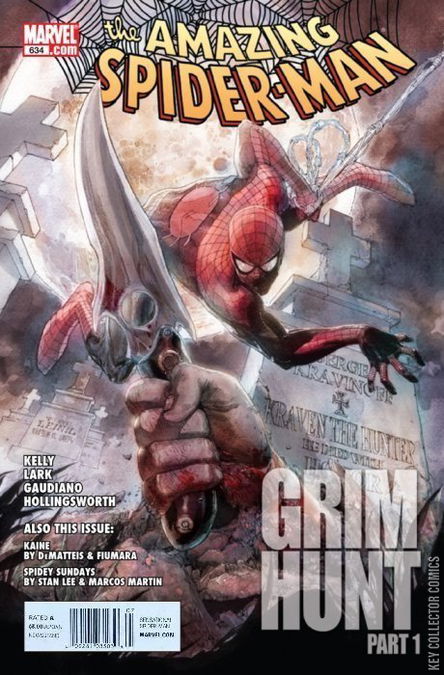 THE GRIM HUNT, CHAPTER 1 / HUNTING THE HUNTER, PART ONE: ADRIFT / SPIDEY SUNDAYS A SPIDER-MAN EPIC TWO DECADES IN THE MAKING BEGINS! Several years ago, one of Spider-Man's greatest enemies, Kraven the Hunter, stalked his last prey, dying with a violent, misbegotten honor. Now, two women claiming to be his wife and daughter have tracked Spider-Man, through the urban jungle, weakening him through the Gauntlet while they prepare to attempt an unholy resurrection. They're hunting Spiders...and Spider-Man's friends and namesakes are in their sights. Written by Joe Kelly and drawn by Michael Lark ( DAREDEVIL ) this is only the beginning of a Spider-summer that will be talked about for years to come. ALSO BEGINNING THIS ISSUE: TWO EXCLUSIVE FEATURES! Original Spidey creator Stan Lee returns with Marcos Martin for a 2-page Spidey Sunday Feature that brings the real world into Spidey's world! PLUS: J.M. DeMatteis , author of the classic ' Kraven's Last Hunt ' returns to the Amazing Spider-Man with Max Fiumara to explore an unknown confrontation between Kraven and Spidey's violent doppelganger KAINE...a battle which promises ramifications on the Grim Hunt itself.