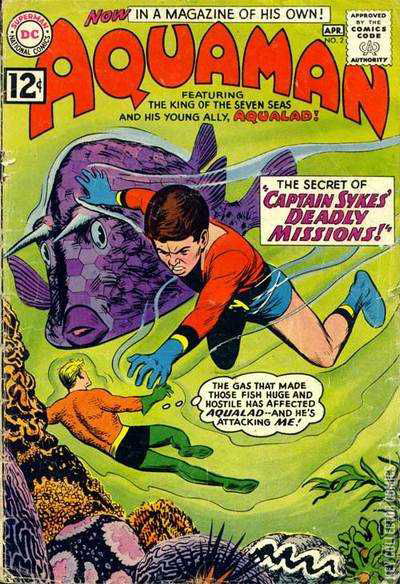 On the hunt for the missing cargo ship Vulcan, Aquaman and Aqualad instead encounter one Captain Sykes, and his ship, the S.S. Seahawk. Captain Sykes wastes no time in boasting that it is he who has spirited away the Vulcan, and her crew. Using the hostages as leverage, Captain Sykes forces Aquaman to retrieve two ancient relics, for his "maritime collection." Following a map provided by Captain Sykes, Aquaman and Aqualad locate the resting place of the first relic, dead center in an enormous coral mountain. Issuing out a telepathic command, Aquaman instructs hatchet fish & swordfish to begin chipping away at the coral, while a host of other fish carry away the debris. Finally, Aquaman commands a porcupine fish to break through the remaining thin layer of coral separating them from the artifact. Upon breaking through the final barrier, an unknown gas is released into the chamber. The effects of the gas are twofold. Three of the fish... the porcupine fish, a cow fish and a goosefish... all grow to gargantuan proportions, while becoming increasingly agitated. Aquaman and Aqualad attempt to flee the chamber, but the goosefish blocks the egress. Surrounded, Aqualad desperately swims into their midst, to drive them off before they reach Aquaman. Exposed to the gas, Aqualad, too, expands to giant size. Aqualad makes quick work of the enormous fish, before turning on Aquaman. Before Aqualad can attack his mentor, the last of the gas seeps from the chamber. No longer under the influence of the gas, Aqualad returns to normal size and sanity. With the danger passed, Aquaman retrieves the relic from the broken coral cavern. It is a small chest, with no visible opening. Aquaman returns to the S.S. Seahawk, and turns the chest over to Captain Sykes. Aquaman is given another map, with the location of the second artifact marked upon it. This time, their destination is Pecos Island. As Aquaman and Aqualad draw near to Pecos Island's coast, a great sea serpent surfaces from beneath...