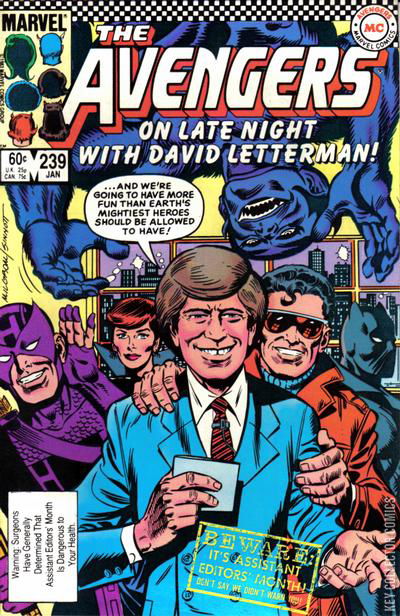 "Late Night of the Super-Stars" Hawkeye arrives at Avengers Mansion with his new bride, Mockingbird. Even as the couple accustoms themselves to the Vision's new hologram form, Wonder Man calls to ask if the team will aid his acting career by appearing with him on the David Letterman Show. With the regular members on a mission, the Vision recruits several former members, and soon Wonder Man, Hawkeye, and Mockingbird are joined by the Black Panther, the Beast, and the Black Widow. Fabian Stankowicz, the Avengers' bumbling antagonist, invades the TV studio in disguise and installs various of his inventions, which attack the heroes on stage, while Stankowicz brazenly takes the guest seat and explains his devices. When Letterman produces a giant doorknob and knocks him momentarily senseless, then deactivates his power source, the Avengers make short work of Fabian's creations. To Wonder Man's dismay, however, the show's telecast is ultimately pre-empted by an emergency news bulletin.