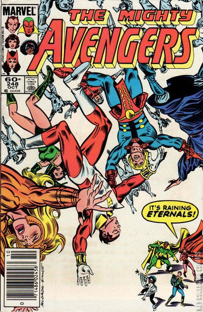 "To Save the Eternals!" Maelstrom has captured the Uni-Mind in a beam intended to drain its raw mental energy for his own use, ultimately killing the Eternals. Having swiftly arrived by quinjet, the Vision attacks the villain, while the Scarlet Witch first frees, then disrupts the Uni-Mind. His ability to absorb kinetic energy, thus using his opponents' strength against them, enables Maelstrom to stand against the Avengers' combined might, but when the struggle begins to turn against him, he summons his ally, Deathurge, whose ebony spear passes through him, leaving him dead and cold. The immaterial Deathurge then easily escapes. In the wake of battle, most of the Eternals, acting on the Uni-Mind's decision, soon depart for space, while a comparative handful elect to remain on Earth.