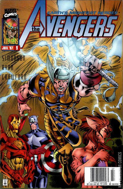 SHADOWBOX Thor, Hellcat, Iron Man, and Hawkeye have been ambushed at Avengers Mansion by the Masters of Evil, a group that has appeared seemingly out of nowhere to destroy them. The group easily defeats them and when Thor is about to kill Klaw, Captain America (just arriving after he severed ties with the American Government) stops him and reminds them all that so long as he leads the Avengers, the group will not kill. Sick of the Avengers soft-handed approach with dealing with their enemies, Thor would leave the group. Worse still, this latest attack would has also demoralized Hellcat and Hawkeye into considering quitting the group as well, leaving Captain America and Iron Man to wonder what will happen to the Avengers. Questioning the Black Knight, Captain America learns that they only attacked the Avengers in order to obtain fame and fortune. He then leaves Iron Man to shackle them up while he goes off to check on the Swordsman. Meanwhile, in limbo, Loki, Enchantress and their slave the Scarlet Witch plan the next phase of Loki's plot to destroy the Avengers. Back on Earth, Janet van Dyne arrives at Avengers Mansion and asks Iron Man to help her find Ant Man who she hasn't been able to find for days. Realizing that the answer to Hank's whereabouts may be found in investigating the remains of the Vision, Iron Man takes Janet and flies off to the SHIELD helicarrier to investigate things further. With the Masters of Evil left unattended, Loki appears and absorbs them into his body as well. Inside the Vision, Ant-Man revives and realizes he was foolish to approach the Vision's brain without being careful for energy surges. Backing up he begins checking on the Vision's diagnostics. Ant-Man learns that the Vision has been moved to the SHIELD helicarrier, but someone has been accessing the Vision's data from within Avengers MAnsion. Before he can shut down the Vision he is attacked by the androids immune system and sent fleeing, he is caught by Iron Man on his way out. Outside of the Visions body, Iron Man and Janet examine it until they are confronted by Nick Fury and SHIELD who demand to know what they are doing snooping around the helicarrier. Fury demands that Iron Man hand over Ant Man for debriefing, and Janet shrinks down to Wasp size to be with her boyfriend. Before things can get straightened out Iron Man's armor detects the fact that the Vision is about to self destruct and carries the body outside of the helicarrier where it detonates harmlessly. As Iron Man escape with Ant Man and the Wasp, Ant Man tells Iron Man to call Captain America as he has learned of something terrible going down. Elsewhere in the city, Thor broods over what to do next now that he has left the Avengers when he is confronted by the Enchantress. She uses her charm and magics to turn him over to her side and he agrees to fight for Loki's cause. Captain America meanwhile, arrives at the hospital where the Swordsman has been recovering since he was injured by the Hulk. He finds the Swordsman's bed empty and the doctor on duty tells him he heard screaming from the room, but when he entered he was gone. Cap is then radioed by Iron Man and asked to meet with him on Avengers Island. At Avengers Mansion, Hellcat laments over her animal life features and considers herself a freak. Loki takes advantage of this by appearing before her with the inert body of the Scarlet Witch. Although Hellcat initially attacks, Loki's smooth talking convinces her that he is not coming to her as an enemy but to offer her the beauty she's always wanted by transferring her essence into the body of the Scarlet Witch. Finally, at Avengers Island, Iron Man, Ant Man, Wasp and Captain America are shocked to find that something has reactivated the gamma core, and somehow it is spawning old Avengers foes: the Super-Adaptoid, the Grim Reaper and the Living Laser. Realizing it's some sort of wrinkle in reality, Iron Man disperses the forming ghost images of these foes with his repulsor rays. However the energy begins to build up again, when Captain America wishes that Thor could be there for them, they are surprised when a second Thor materializes right out of the gamma core.