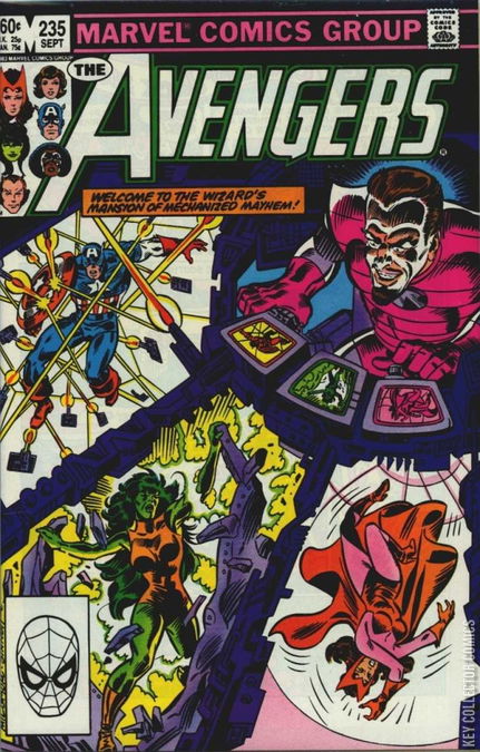 "Havoc on the Homefront!" The authorities discover that the Wizard has escaped from prison, leaving one of the Plantman's simuloids in his place, and the Avengers are called in to recapture him. Several of the heroes are currently wrestling with personal problems, as Captain America darkly ponders Tony Stark's alcoholism, the She-Hulk tries unsuccessfully to acclimatize in New York, and the Scarlet Witch worries over the Vision's condition, but the Wasp nonetheless assigns these three to search the Wizard's former home. The Wizard has indeed gone to ground at his futuristic domicile, where he turns its many security devices against the trio. Cap finds himself weightless in an anti-gravity chamber, the She-Hulk is caught in a dimensional matrix, and Wanda is trapped in a pocket of non-causality in which the normal laws of probability are negated. However, when Wanda's hex deflects the Wizard's power back into his master control, he is forced to flee his stronghold and is quickly taken into custody.