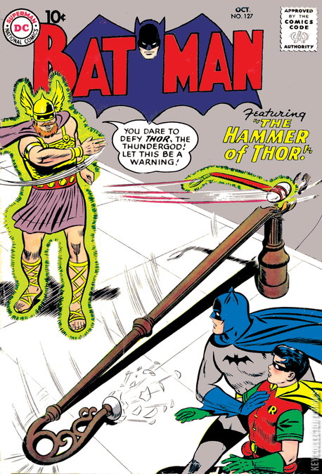 THE CAPED CRUSADER RUMBLES WITH THE GOD OF THUNDER! Have Batman and Robin found themselves battling the mythical Thor? It sure looks that way, and when this God of Thunder tries to put the hammer down on the Dynamic Duo, he may prove more than a match for the mighty masked marvels! Not enough excitement for you? How about a look at how Bruce Wayne's life might have been in a world where crime didn't claim the lives of his parents--and the astounding adventure of Batman and Robin's newest super-powered ally, Alfred Pennyworth, the Eagle!