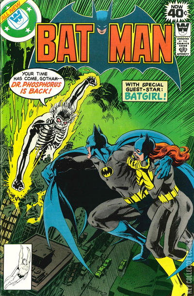 DR. PHOSPHORUS IS BACK! After the twice-rebuilt Gotham Nuclear Reactor goes critical for ten minutes, Batman investigates, finds glowing footprints at the site, and deduces that Dr. Phosphorus is back. A group of protesters has gathered to demand that the plant be shut down as a safety hazard. Phosphorus, who has made the plant his new home, thinks otherwise. Meanwhile, Batgirl defeats Killer Moth in Washington, D.C., and comes to Gotham City as Congresswoman Barbara Gordon to make a speech advocating the closing of the nuclear plant and the dismantlement of the nuclear power industry. Batman meets with her after checking on Rupert "Boss" Thorne at Arkham Asylum and failing to capture Dr. Phosphorus, who threatens to "reign over all!" Batman abruptly realizes that Phosphorus intends to seed clouds with irradiated material and rain fire on Gotham City. He and Batgirl track down Phosphorus at the airport where he is trying to commandeer a small plane. Batman smashes into the plane with his Batmobile and halts it, but is dazed. Batgirl is menaced by Phosphorus, but captures him by wrapping him up in Batman's radiation-proof cape and tying it up with a Batrope. Batman revives and finds the situation well in hand.
