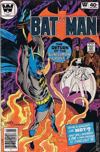 NEVER GIVE UP THE GHOST! Batman interrupts the Gentleman Ghost and his two-man gang in the process of stealing industrial diamonds inside a darkened factory. The theft is thwarted, but the villains escape and the Ghost tells his men they will try to steal the jewels another time. During these events, one of Joker's henchmen is taken from the police by an elaborate scheme by the Clown Prince of Crime. Later, Batman resumes his Bruce Wayne identity, reopens Wayne Manor, and hosts a costume ball with the attendees dressed as famous persons from the past. Selina Kyle is Bruce's date for the party and she comes dressed as Catherine of Aragon (to match Bruce's Henry VIII costume), insisting on being called "Cat". During the ball, Alfred notifies Bruce that an alarm Batman had left at the factory has gone off. Bruce is forced to leave the ball and become Batman to investigate. At the factory, Batman is tricked and knocked out by the Ghost. He awakens to find himself manacled to a chain by his wrists and suspended by a winch-and-pulley system over a cauldron of sulfuric acid. The Ghost activates the winch and leaves, telling Batman he has a date at a party in a mansion. Batman frees himself by using slack in the chain to swing himself away from the acid vat and breaking open the manacles on the gears of the winch. He then returns to Wayne Manor, where he captures both of the Ghost's hirelings but not the Ghost himself. The Gentleman Ghost fades into the fog, promising to return and to take Gotham, but Batman insists that he'd be waiting.