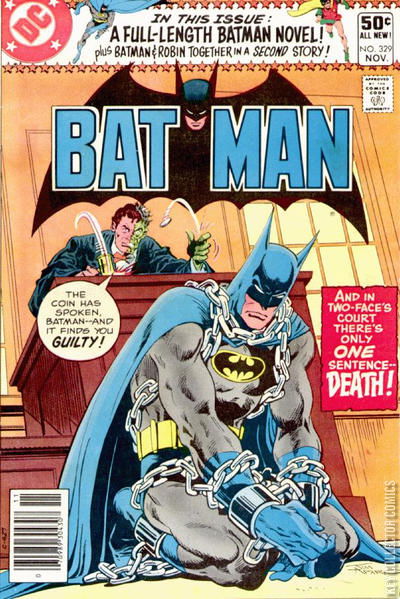 TWICE DIES THE BATMAN! Batman's attempts to track down more clues to the murder of Anton Karoselle at the file room of Dr. Ekhart and at the Gotham Morgue are foiled by bombs. However, he does manage to ascertain that Anton Karoselle was a patient of Ekhart's, and that he did not even exist as "Karoselle" until a year ago. Batman tells Alfred he is certain of the murderer's identity, and intends to bring him in. Carl Ternion breaks off a dinner date with Gilda Stevens when his plastic surgery finally fails and he reverts to the countenance of his former identity-- Two-Face. Batman, finding clippings referring to Two-Face's origin, Harvey Dent's marriage to Gilda Gold, and the apparent death of "Boss" Moroni in Karoselle's files, enlists the help of a sorrowing Gilda in a plot to capture Two-Face. As part of his plan, he goes to the Batcave to prepare a special film. Later, Two-Face sees a man who appears to be "Boss" Moroni "kidnap" Gilda Stevens and drive away with her. Following them in another car, Two-Face snarls that he killed Maroni twice already, and remembers how Maroni devised his "Anton Karoselle" identity with Ekhart's plastic surgery, after being paralyzed from the waist down in an encounter with Two-Face. Karoselle killed Gilda's second husband, Dave Stevens, to spite Two-Face; and the latter, who forced Ekhart to perform the surgery that enabled him to become "Carl Ternion," killed "Karoselle" in retribution. Two-Face follows "Moroni" and Gilda into a courthouse, unmasks his foe as Batman and attacks him, chaining him to the ground. Batman tries to reason with Two-Face, but when this fails, Alfred projects the film of Two-Face's origin, throwing the double-visaged villain off balance. Batman tries to convince that Two-Face has not killed his good side or his love for Gilda, just as she appears and convinces him of her love, inducing him to return to Arkham Asylum for rehabilitation. Two-Face goes through a breakdown, but he agrees with the plan and he goes with the authorities, hoping to someday be cured and return to Gilda as a new man. The love and hope of Harvey and Gilda, reassures Batman's confidence on his mission. THE CASE OF THE HIJACKED HEART Gotham ganglord "Razor" Reynolds has checked into the Gotham General Hospital for a heart transplant, and Batman and Robin have to fight off rival crooks out to kill him. Batman swings off, and Robin checks on Mary Ann Warner, the bag lady previously beaten by Two-Face's hoods. Her doctor wonders why Batman has not checked on her in the two weeks since her beating. The heart to be transplanted into Reynolds's body arrives later at the Gotham airport, but a number of thugs try to steal it and prevent its delivery. Batman and Robin have to fight them off and after they are defeated, one of the crooks tells who hired them. Robin returns to the hospital, hands the canister with the heart to the doctors, and has Reynolds's daughter, Pamela arrested. Pamela confesses that she wanted revenge for her mother, to whom Reynolds gave everything but love. Once the situation is under control, the doctor and Robin are drawn away to Mary Ann's room by a nurse who tells them an alarm is going off there. They arrive just in time to see Batman swinging off, having deposited two boxes of candy and a large supply of flowers in the room.