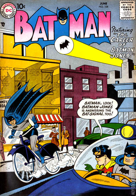 THE BIG BATMAN QUIZ Batman appears on The Big Quiz program to verify the answers given by contestant Frank Davis, who stands to win $125,000 from correct responses to questions about Batman's career. Emcee Joe Harmon feeds Davis some tough Batman questions, but the contestant answers them all correctly. Finally, Harmon places Davis in an isolation booth with a notepad and asks him the question, "What is Batman's Secret Identity?" Though Batman blocks off the camera's view, he is able to see that Davis has written, "Batman is Bruce Wayne"--only seconds before he collapses in the booth, and dies of poisoning. Robin notes that the notepad which Davis wrote Batman's identity on is blank, and believes someone has stolen the page with his real name. Suspicion is thrown upon Garth, a convict brought under guard to appear on a crime program, whose guard was slugged during the quiz show. In the search for the escaped convict, Batman encounters a man who appears to be Garth, but his expert knowledge of the studio layout makes Batman suspicious. Later, as Harmon hands Batman the question envelope, Walsh, the owner of the show, confirms that Davis was supposed to have been asked what the contents of Batman's utility belt were, not what his secret identity was. Ergo, the real murderer switched the envelopes. Batman confirms that the poison was a sort of harmless in liquid or solid form, but deadly as a gas. Restaging the scene, Batman shoves Harmon into the isolation booth. Harmon desperately tries to break out, hollering that he will be poisoned. Batman tells him that he has replaced the original bulb that Harmon had painted with poison and used the ruse to force Harmon to confess. Batman then points out that Harmon gave himself away with makeup grease on the envelope he handed Batman--makeup which he used to imitate Garth, who has since been found trussed up in hiding. Harmon confesses that he had tried to cut a deal with Davis for a 50% cut of the prize in return for answers to the questions; Davis had refused and said that he would expose Harmon after the show. Harmon pulls a gun, but Robin distracts him by shattering the original poisoned light bulb , and Batman KO's him. Later, Batman reveals that the poison gas bleached out the writing on the page with his secret identity, so all is well. PRISONERS OF THE BAT-CAVE John Roddy, convicted of killing a man named Winters and scheduled for execution, pleads his innocence to Batman, who believes him. Batman goes to the Governor and gets a slight delay, only until midnight of that night. At the district attorney's office, Batman and Robin pick up two packages, one of evidence in the Roddy case and the other a special package addressed to Batman and Robin. By an electrical mishap both are trapped in the Batcave, and the second, special package, actually a booby-trap, bursts into flame and melts their radio transmitter and telephone. Batman puts it out by lowering a hollow, glass bust of Two-Face onto it. Determining that the crime was committed by a man with a much longer thumb than Roddy, the dynamic duo proceed to deduce exactly who the killer was, and discover him to be Len Paul. Batman uses an insulated diving suit to help him survive touching a powerful electric charge to the Bat-Cave's lock mechanism, freeing them. Then they race to apprehend Len Paul and save Roddy's life with only minutes to spare. THE CAREER OF BATMAN JONES Years ago, near the genesis of his career, Batman used his Batmobile to stop an out-of-control car, saving the family within. The grateful father and mother named their newborn son Batman Jones in his honor. Batman, in return, built a "Bat-Coop" crib for him and posed for reporters' pictures with the family, holding the baby himself. Since Batman never took rewards, ofttimes the people he helped sent presents or money to the Jones family in his stead, so Batman Jones grew up with Batman as his idol. Then, one night when the Bat-Signal drew Batman and Robin to police headquarters, they witnessed the arrival of young Batman Jones, clad in a homemade uniform and riding a bike. Commissioner Gordon asked Batman and Robin to help recover a silver statue stolen from a millionaire's home. By threatening to launch his own investigation, Batman Jones blackmailed the dynamic duo into taking him along to keep him out of mischief. The boy proves of use indeed when organizes a game of hide-and-seek among a group of neighborhood boys, and uses their talent at finding places to hide to uncover the stolen statue's hiding place. Batman intercepts the thief as he returns for his booty. Later, Batman and Robin take their protégé to the Bat-Cave, claiming to be taking him for a training session. In reality, they intend to show him that crime-fighting is too difficult for him to master, and thus discourage him. But, Batman Jones proves quick-witted and agile enough to pass their tests, and after they send him back home, the two heroes admit they have to try another tack. On his own, Batman Jones deduces that crooks will try to use the machine tools exhibited at a hobby show to tunnel through a connecting wall into the bank next door. The youth is there to see the crooks try their hand, but Batman and Robin are also present and apprehend the thieves. However, Batman Jones has discovered a stamp exhibit while at the show, and gets so engrossed with it that he slacks off his Batman-isms in favor of stamp collecting. Relieved, Batman and Robin hit the road.
