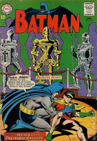 ATTACK OF THE INVISIBLE KNIGHTS! A collection of Black Opals that date back to medieval times are presently on display at the Gotham Museum, however each night it appears as though the suits of armor on display are moved every night. Finding it suspicious, Batman and Robin are called in to investigate. That night the dynamic duo are attacked by the suits of armor, and afterwards find that the opals have been stolen, and that the suits of armor weren't possessed by ghosts, but controlled with magnets instead. Batman and Robin then track the Opals to museum employee Wilburn Jenkins who is attempting to sell them off. Batman and Robin stop them and turn them over to the police. The very next day, Batman and Robin in their civilian identities of Bruce Wayne and Dick Grayson go and see the Opals on display. ROBIN’S UNASSISTED TRIPLE PLAY! After a night of studying, Dick Grayson goes down to the Batcave to see what Bruce Wayne is up too. There, he sees that Bruce has put on the finishing touches on a video surveillance system that allows them to monitor Gotham City. Noticing a crime in progress, the two change to Batman and Robin and rush out to stop the crooks involved. However, Batman gets an urgent call from the Justice League of America, and so leaves Robin to handle the situation on his own. Unable to stop the crooks (who use plants to execute their heists) Robin tracks them to their base, and attacks them. By creating a distraction (a rock crashing through the window) to make the crooks think that Batman is also present outside, Robin is able to gain the upper hand and capture the crooks. The next day, Robin reports to Bruce explaining that he was able to give the illusion that Batman was there by putting a rock on a pulley system to make the rock crash through the window.