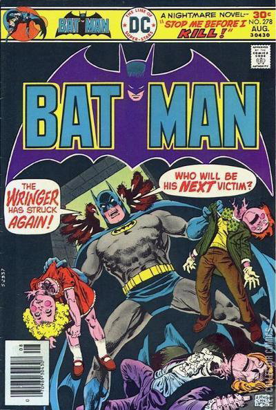 STOP ME BEFORE I KILL BATMAN Inspector Clive Kittridge of Scotland Yard, visiting in America, is allowed to accompany Batman on patrol and, while doing so, becomes involved in his latest case. A marionette with a wrung neck is delivered to Batman by Commissioner Gordon, shortly after Batman and Kittridge have encountered a redheaded man who desperately tried to tell them something but was unable to force any words from his mouth. Days later, Batman encounters the Wringer, who proves to be the same man, wringing the head of a marionette made of Douglas fir. Batman and the Wringer fight, but the villain escapes. Later, on patrol near the park, Batman beholds the Wringer twist the neck of a walking, talking doll, and again fights him to no conclusion. Finally, while Bruce Wayne and Kittridge are attending a Bicentennial exhibit featuring audio-animatrons resembling historical American figures and reciting canned speeches, the Wringer destroys "Patrick Henry" just as the robot is saying "Give me liberty or give me--". At this point, Batman has deduced The Wringer's real target, a stockbroker named Douglas Walker on Park Avenue. The clues to this deduction were the Douglas fir marionette, the walking doll found near the park, and the Wringer's destruction of the Patrick Henry robot just before it would have said "death". The Wringer, who blames Walker for losing the money he had invested with his brokerage, attempts to kill him, but Batman appears to capture the villain. Later, Batman states that the Wringer was caught in conflicting impulses, wanting to kill Walker and yet wanting to be stopped from doing so. After witnessing the Batman at work, Clive Kittridge is impressed and even loses a wage against Bruce Wayne.