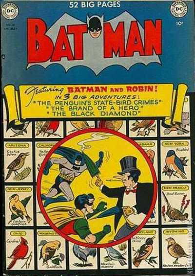 THE STATE-BIRD CRIMES! Paroled from prison once again, the Penguin attempts to convince the Birdlovers' Society to elect the Penguin as a state bird. After the Society mocks him, he gets revenge by robbing them one by one until he is stopped by Batman and Robin. THE BRAND OF A HERO! When Bruce Wayne and Dick Grayson learn of an unsolved mystery from the past, they ask Professor Carter Nichols to send them back in time where they discover the truth about the mystery. THE BLACK DIAMOND! A crime lord known as The Black Diamond is helping notorious criminals escape from prison to make them join his gang. When his new gang is gathered, Black Diamond asks them to kill Batman by any means necessary. The first two attempts to kill Batman are not successful, but on the third attemp the criminals manage to shoot the hero. However, it was all part of a plan to capture the criminals and Batman was never really in danger. By the end, Batman tracks down the Black Diamond and captures him, allowing the police to arrest the criminal mastermind.