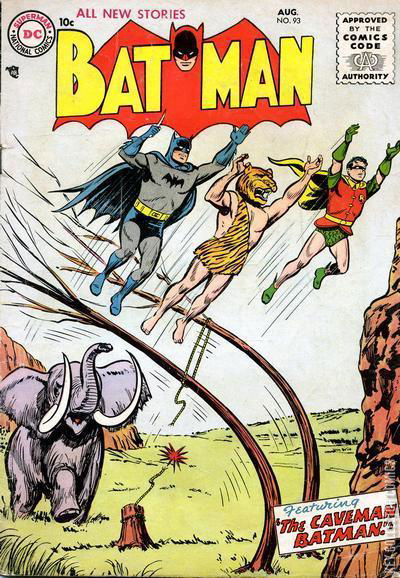 JOURNEY TO THE TOP OF THE WORLD! Batman and Robin are summoned by the FBI and tasked to recover a valuable microfilm atop Mount K-4 in the Himalayas. The microfilm was lost in an accident and it contains the names of many members of an international crime cartel. For this purpose, the Dynamic Duo join a mountain expedition to the mountain as Bruce Martin and Dick Green. During their mission, they come across a criminal hired by the underworld who wants to retrieve the microfilm before the law enforcement. Batman and Robin fight the criminal on the mountain and they manage to retrieve the microfilm, after which they return home. BATMAN, BABY-SITTER! Bruce Wayne's cousin, Jane, drops off her baby Junior unexpectedly at Wayne Manor, hoping for Bruce to take care of him. Bruce is forced to deal with the baby and he recruits Robin and Alfred's help to check over the baby while he goes to fight crime. Batman's job as a crime-fighter is just as demanding as taking care of the kid, who innocently starts calling Bruce, "Batman." After a series of events, Jane returns and takes Junior home, giving the heroes a break from such strenuous activity. THE CAVEMAN BATMAN An archaeologist finds evidence that men and dinosaurs existed together at one point, but his discovery is considered fake by the Gotham Museum. In order to learn the truth of the mystery, Batman and Robin ask their friend Carter Nichols to send them back in time to the pre-historic era, where they find a hero by the name of Tiger-Man. The Dynamic Duo help Tiger-Man confront the villain called Borr, who keeps a frozen dinosaur in his cave hideout and threatens the nearby tribemen with its release if they don't comply with his wishes. During the confrontation, the ice that contains the beast begins to thaw and soon, the dinosaur is free to roam among men. The dinosaur does not live long in the environment of the Stone Age, but served its purpose by driving out Borr and his men. Tiger-man pledges to recreate the entire story on stone, thus giving an explanation for the archaeologist's discovery.