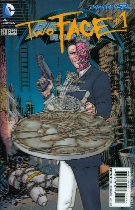 A TALE OF TWO-FACES With the Batman missing, Two-Face has two choices; save Gotham City, or make it bleed. Though he flips his coin, it is caught in mid-air by the Scarecrow, who suggests that they instead join their escaped Arkham brethren. Two-Face has no interest, particularly since he put many of them away, when he was District Attorney. Angrily, he threatens to shoot Crane through the head if he doesn't return the coin, so the Scarecrow makes him guess which hand he's hiding it in. After making his choice, Scarecrow opens his palm to reveal a different coin - one of the communication devices used by the Secret Society. Crane explains that the coin is an invitation from the Crime Syndicate - those responsible for the chaos ongoing in the city. If Two-Face agrees to come when the Syndicate calls, he will have help when he needs it. Two-Face flips his own coin on whether to join or not, and finds himself accepting the invitation. He warns Scarecrow, though, that regardless of who he has agreed to join, the coin will always have the final say. Finally, Harvey returns to his initial decision. Heads he saves Gotham; Tails, he lets it bleed. The coin turns up Heads. From that point on, Two-Face is a public defender, all over again, killing thugs and psychos alike, and dragging the survivors to the courthouse. As he steps inside among the corpses of murdered lawmen, Harvey remembers when he used to work there, as DA. He was well liked by those he worked with, and good to them. At the time, he, the Commissioner and the Batman had been trying to bring down Erin McKillen, the wife of a mob-boss who had recently died, and who had taken up his crime empire in his absence. Since then, though, his old office is now home to the current DA, Richard Ozu. The office itself (and the innocents inside it) though, are under attack by the former minions of Terminus - those who have been wronged by the Batman's excessive use of force. After warning them away of those with whom he used to be coworkers, he rounds everyone up, and herds them down to the courtroom so that justice can be meted out. Sitting at the judge's bench, Harvey begins flipping his coin; heads for life in prison, tails for death. His swift and efficient sentencing is interrupted by an armed group who claim that the men he is killing were tasked by the Society with gathering prominent Gothamites, and hanging them from the East River Bridge as a message to the world. If his prisoners and victims can't do it, Two-Face will be forced to do it instead. He reminds them that his joining the Society was conditional on the supreme deciding power of the coin, and flips it, finding that these prominent Gothamites should live. The gang ignores his judgment, and kills everybody. Angrily, Two-Face turns on them, announcing that they have negated the deal he made, and he will not longer be party to the Society's plans. With that, he shoots the gang members dead, and places the Society's coin into the open mouth of the gang's dead leader. Harvey retrieves his own coin, and decides to give that first decision another go. Heads, save Gotham; Tails, make it bleed. The coin lands Tails-side up.
