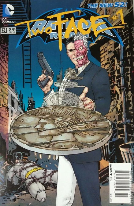 A TALE OF TWO-FACES With the Batman missing, Two-Face has two choices; save Gotham City, or make it bleed. Though he flips his coin, it is caught in mid-air by the Scarecrow, who suggests that they instead join their escaped Arkham brethren. Two-Face has no interest, particularly since he put many of them away, when he was District Attorney. Angrily, he threatens to shoot Crane through the head if he doesn't return the coin, so the Scarecrow makes him guess which hand he's hiding it in. After making his choice, Scarecrow opens his palm to reveal a different coin - one of the communication devices used by the Secret Society. Crane explains that the coin is an invitation from the Crime Syndicate - those responsible for the chaos ongoing in the city. If Two-Face agrees to come when the Syndicate calls, he will have help when he needs it. Two-Face flips his own coin on whether to join or not, and finds himself accepting the invitation. He warns Scarecrow, though, that regardless of who he has agreed to join, the coin will always have the final say. Finally, Harvey returns to his initial decision. Heads he saves Gotham; Tails, he lets it bleed. The coin turns up Heads. From that point on, Two-Face is a public defender, all over again, killing thugs and psychos alike, and dragging the survivors to the courthouse. As he steps inside among the corpses of murdered lawmen, Harvey remembers when he used to work there, as DA. He was well liked by those he worked with, and good to them. At the time, he, the Commissioner and the Batman had been trying to bring down Erin McKillen, the wife of a mob-boss who had recently died, and who had taken up his crime empire in his absence. Since then, though, his old office is now home to the current DA, Richard Ozu. The office itself (and the innocents inside it) though, are under attack by the former minions of Terminus - those who have been wronged by the Batman's excessive use of force. After warning them away of those with whom he used to be coworkers, he rounds everyone up, and herds them down to the courtroom so that justice can be meted out. Sitting at the judge's bench, Harvey begins flipping his coin; heads for life in prison, tails for death. His swift and efficient sentencing is interrupted by an armed group who claim that the men he is killing were tasked by the Society with gathering prominent Gothamites, and hanging them from the East River Bridge as a message to the world. If his prisoners and victims can't do it, Two-Face will be forced to do it instead. He reminds them that his joining the Society was conditional on the supreme deciding power of the coin, and flips it, finding that these prominent Gothamites should live. The gang ignores his judgment, and kills everybody. Angrily, Two-Face turns on them, announcing that they have negated the deal he made, and he will not longer be party to the Society's plans. With that, he shoots the gang members dead, and places the Society's coin into the open mouth of the gang's dead leader. Harvey retrieves his own coin, and decides to give that first decision another go. Heads, save Gotham; Tails, make it bleed. The coin lands Tails-side up.