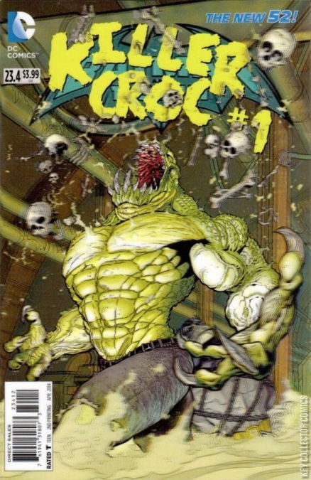 BLOOD IN THE WATER Twenty-six years ago, young Waylon Jones had refused to let his Auntie Flowers scrub the scales from his flesh. She warned that in their rough neighborhood of Crown Point, the way he looked would make him a target, and he had better do the scrubbing himself, if he wouldn't let her do it. These days, corrupt cops Detectives Boone, Greer, and Sanchez of the GCPD SWAT team, are trudging through the sewers looking for Jones, who is now the Killer Croc. Waylon feels that, like him, Gotham City is going through a period of atavism - reverting to its a more primitive state. And that chaos means murdering the detectives is fair game. Seventeen years ago, Waylon had joined a travelling circus outfit with Ed Geisel, appearing at music festivals and fighting a real crocodile as a shock-act for punks and grunge enthusiasts. That was where he earned his title as Killer Croc. Unfortunately, once he got out on the road, the $100 per show that he was promised became $40, and Ed was willing and eager to take advantage of Waylon's seemingly gentle demeanor, despite his appearance. This was a mistake on Ed's part, because Waylon was more than willing to bite the hand that fed him. Three years ago, Waylon had his first encounter with Batman and Robin. He had been thwarted in a jewelry store robbery, and he was demoralized when Robin suggested that he was too dumb to pull off a job like that on his own, and should stick to being muscle instead. Now, Boone and Greer - the only members of their team to survive Croc's attack, struggle to escape the maze of tunnels beneath the city. They are surprised when they encounter a group of street-people living down there, and beg for help. Unfortunately, the people are loyal to Croc, because he took them in and showed them how to live down there, and they break Greer's leg. Hurrying away, Boone is forced to leave Greer behind while he gets help. Unfortunately, the first door he opens contains the body of Hoolihan - a clean cop that he had killed just weeks before for threatening to rat he and his partners out to the brass, and dumped into the bay. The day before, Boone, Greer, and Sanchez had received a note threatening that evidence against them had been found in the form of a key, and they would need to go to the sewer to get it - and bring money. Now, Jack Boone manages to find the key on Hoolihan's body, and gleefully announces his success to Greer, only to see her torn to pieces by the Killer Croc. Rather than attack Boone, Waylon plays on Boone's fear, and simply follows him through the tunnels as he runs for his life. Before long, Boone falls from a sudden ledge, and is impaled on some junk-metal below. As he lays dying, Boone realizes that it was Croc who sent them the note, and wonders why he had sent it. Rather than answer him, Waylon just crushes his skull. Twenty-six years ago, Waylon had been bullied by the other kids in his neighborhood, and he was depressed because he felt that maybe they wouldn't have if he could have brought himself to do as his aunt warned him to, and scrub off his skin. He had an unexpected friend in Officer Hoolihan, who had brought him ice-cream and explained that whatever Waylon looked like, he would be something - a king maybe. With his old friend avenged, Waylon returns Hoolihan's body to his followers, and explains that while they had been told for all of their lives what they could not have and could not be, the people who had told them that were wrong. While the people above fight over territory in Gotham City, he would begin an empire underground - the largest territory in all of Gotham. His followers will be his eyes above ground, and he will be the deadly jaws beneath. As the people cheer him, Waylon realizes that he was made to be a king.