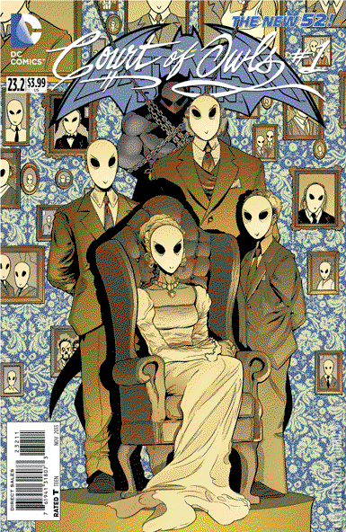 EXQUISITE DREAD For years, the Talons have lived to see the expression of dread pass over the faces of their victims as they realized that the legends they had disbelieved for years - dismissed as a childish nursery rhyme - were true, and that they were going to die at the command of the Court of Owls. Now, Gotham City is in shambles, as the Crime Syndicate has announced that the Justice League is dead, and Gotham's protector - the Batman - with them. Even so, the Court of Owls believes that they will persevere; that their city will survive, as will their way of life. With their existence threatened, they will dig into the foundations of their arcane history, and use it to adapt. In 1914, R.H. Orchard showed the mayor of Gotham City his treasury, hidden within the core of the Orchard Hotel. The mayor was surprised at the opulence, not to mention the palpable disdain of the man who had invited him there. Orchard explained that the mayor's meeting the following day with five national union heads would be unacceptable to his organization. The city, he explained, survived on a balance of power that was created over centuries, and cannot be allowed to be challenged by outsiders. When the mayor demanded just who Orchard thought he was to tell him what to do, he was disturbed to find himself surrounded by men in masks echoing his "who?" back at him, over and over. The next day, the mayor threw the union leaders out of Gotham in outrage, and returned, groveling to the Court, only to be dropped into their labyrinth to be broken and murdered by a Talon. In 1871, a young photographer had discovered the hideout of the Court of Owls at Harbor House, and discovered that their activities were actually mundane and boring. His wife, though, still believed they were dangerous, and warned him against speaking too loudly of it. He was preparing to take the photo he had got of the Court in action to the Philadelphia Press at the Metropolitan Station, and she begged him not to go. As he kissed her goodbye, and prepared to board the train, a noose slipped around his neck from the rafters, and hung him by the neck 'til he was dead. As she screamed for him, a man placed a drugged cloth over her mouth, and by the next day, their deaths were headlines in the Gotham Gazette. Now, a prominent member of the Court leads his daughter down into a safe place - where the Court began. As they enter the tunnels beneath the city, the girl admits that she is scared, and her father reveals that strength comes through fear, recounting the tale of the Gotham Butcher. In 1862, a well-dressed man strode through the Narrows, angrily. Stepping over the threshold of a particular house, he brushed past the mutilated corpses strewn about with disgust. Confronting Felix Harmon, he warned that the papers had dubbed him the Gotham Butcher - a problem, given that none of the Talons are even supposed to be known about, let alone kill without being told to. Tiring of listening to his guest's berating, Harmon reached out, and crushed his skull in one massive fist. The Court had had to spend a decade in hiding after Harmon's indiscretions, but when they returned, they were stronger than ever. The Court of Owls always wins, because it is a part of Gotham City as much as its rivers and caves. The city's foundation would have to be torn up to even grasp at the Court's roots. Curious, the girl wonders how their history can save them from a crazed mob of rioters. Her father explains that while they could use their control of established institutions to quell threats in the past, this situation is more dire, and so they have gone below to the home of the one who started it all. From the shadows, a woman shouts for them to stop, warning that they cannot bring back the first. She had murdered more of their brothers earlier in service of preventing the first's awakening, and she would not hesitate now. To her surprise, though, the man's daughter leaps onto her back, and tears into her flesh with knives. Proud, her father leads her through the great wooden doors to the chamber of the First Talon, eagerly anticipating the look on his victim's faces when they see the first and most terrible weapon that the Court has ever used.