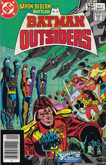 MARKOVIA'S LAST STAND! Batman, Metamorpho, Black Lightning, and Lucius Fox are the prisoner of Baron Bedlam, who is seeking to reclaim the nation of Markovia after his family was ousted from power after the Nazi's lost World War II. Leaving his prisoners to acquire similar powers from Dr. Jace as she gave Markovian co-ruler Geo-Force, the heroes manage to pool their resources and break free of their imprisonment.�� They then meet up with Katana, Halo and Geo-Force and work together to stop Baron Bedlam's army, while Metamorpho rescues Dr. Jace. Geo-Force goes up against Baron Bedlam alone and easily defeats the villain, throwing him to the peasants of Markovia for suitable punishment.�� With the battle won, Batman offers the group to return to Gotham City with him to find new purpose and work together as a team, and thus the Outsiders are born.