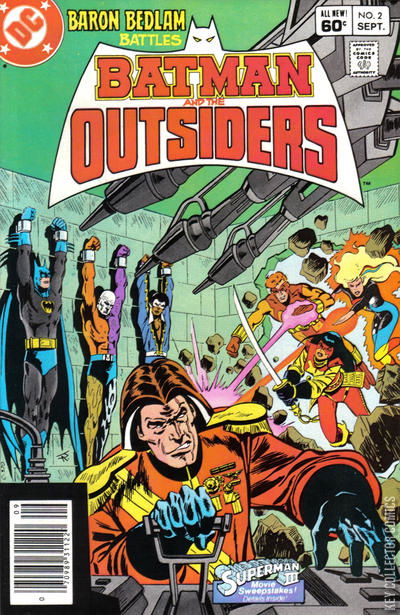 MARKOVIA'S LAST STAND! Batman, Metamorpho, Black Lightning, and Lucius Fox are the prisoner of Baron Bedlam, who is seeking to reclaim the nation of Markovia after his family was ousted from power after the Nazi's lost World War II. Leaving his prisoners to acquire similar powers from Dr. Jace as she gave Markovian co-ruler Geo-Force, the heroes manage to pool their resources and break free of their imprisonment.�� They then meet up with Katana, Halo and Geo-Force and work together to stop Baron Bedlam's army, while Metamorpho rescues Dr. Jace. Geo-Force goes up against Baron Bedlam alone and easily defeats the villain, throwing him to the peasants of Markovia for suitable punishment.�� With the battle won, Batman offers the group to return to Gotham City with him to find new purpose and work together as a team, and thus the Outsiders are born.