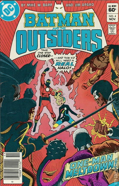 ONE-MAN MELTDOWN As Halo learns to hone her abilities at Outsiders HQ, out at the Gotham State Penitentiary, the former costumed criminal known as Meltdown is informed by his warden that his request for parole has been denied. Going into a berserk frenzy, Meltdown unleashes his powers and breaks out of prison.�� The warden calls Batman for help, and Batman ties the recent thefts of radioactive materials to Meltdown, and so goes with the Outsiders to try and track down the villain and stop him. After a battle near the S.T.A.R. Labs building, Halo ends up as Meltdown's hostage, using her aura powers to his advantage. Halo is rescued by Katana and after a brief moment, the heroes unmask him and learn that Meltdown has been stealing the radioactive materials to keep himself alive after the warden at prison experimented on him.�� Going back to Gotham State Penitentiary, the Outsiders and Meltdown prevent the warden from burning Meltdown's medical records, and turn the warden over to the police. Batman promises to be there when Meltdown applies for parole and afterwards, the bond between Halo and Katana becomes stronger.