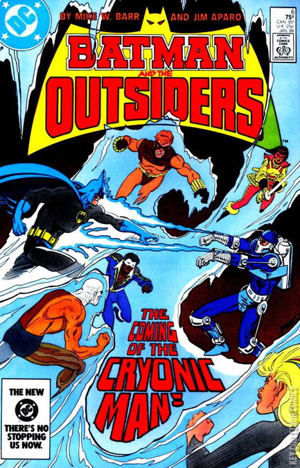 DEAD WARMED OVER! While Halo is sent off to attend her first day of school under protest, Bruce Wayne takes Katana to the site of a future Japanese bookstore which Bruce is helping Katana open in her civilian guise. While Geo-Force and Metamorpho visit Dr. Jace at the hospital following her ordeal with Dr. Light, the two heroes have to stop the new villain the Cryonic Man from stealing an artificially made kidney which is supposed to go to a young girl who is a patient at the hospital. Learning that it is the second time that the Cryonic Man has attacked the hospital, Batman and the Outsiders hope to catch him when Nobel Prize winning scientist Dr. Marcus Dorland (inventor of artificial organs) is scheduled to come to Gotham City. The Cryonic Man, really a man watching over his family who have been under suspended animation for decades, learns of this he seeks to go out and capture Dorland. This attempt leads to a fight with the Outsiders on a Gotham City highway in which the Cryonic Man takes Katana hostage and manages to freeze the entire group in a giant chunk of ice with liquid nitrogen.