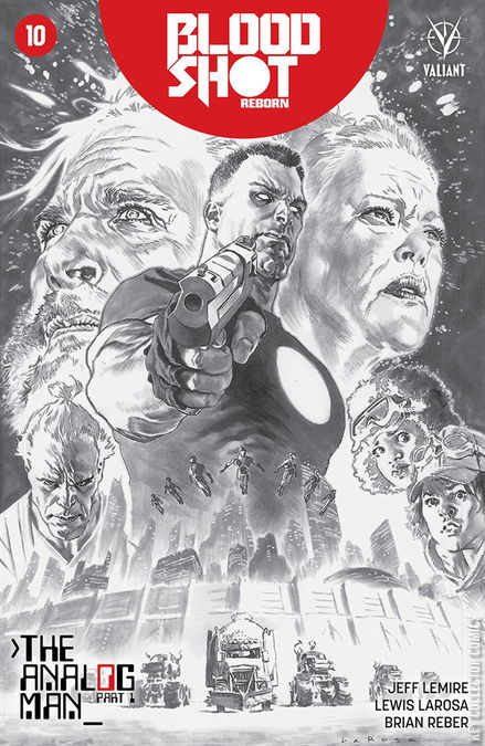 The Analogy Man - Part 1 ALL-NEW ARC! ALL-NEW JUMPING-ON POINT! WHO OR WHAT IS…“THE ANALOG MAN”? Many years from now, Los Angeles has become a post-apocalyptic wasteland and the once unstoppable killing machine known as BLOODSHOT has become THE ANALOG MAN. Hopelessly outdated, Bloodshot’s taken on a new role as the protector of a small town, eking out a subsistence existence with the great love of his life – Magic – and protecting a group of stragglers who’ve weathered the storm. But when a gang of marauders arrives, the settlement’s survival is threatened, and Bloodshot is forced to bring justice to the distorted and disjointed badlands of the Valiant Universe! Blockbuster artist Lewis LaRosa joins New York Times best-selling writer Jeff Lemire for a gasoline-soaked storyline two years in the making right here for “THE ANALOG MAN”!