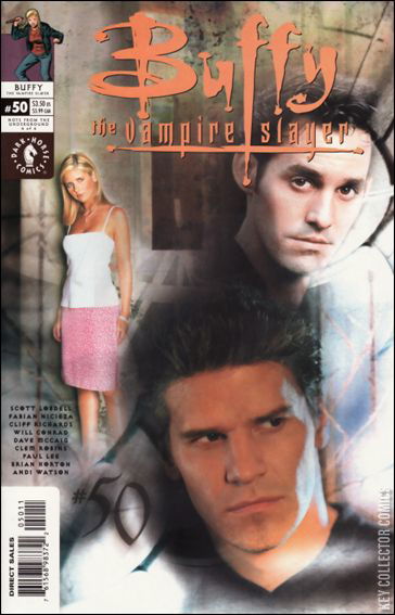 Scott Lobdell wraps up his first apocalyptic run on Buffy with a special fiftieth issue, featuring more story pages, as well as two backup features: a prose story by Lobdell, with illustrations by Paul Lee; a short comic by Andi Watson; and a wraparound painted cover by regular cover artists Lee and Brian Horton. "Hellmouth to Mouth" concludes as Buffy finally rescues Xander and Dawn from the crew that's nearly destroyed Sunnydale -- The Scourge! They soon find that the only thing worse than the Scourge is their secret leader, revealed this issue! Buffy's not just fighting for her friends' and family's lives, she's fighting for a chance to live her own life, to be more than a fearless vampire hunter. Who better to have backing her up than former sadistic Slayer Faith and the vampire hunting vampire himself, Angel?!