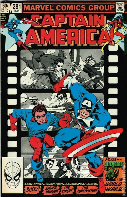 "Before the Fall!" After a night at the movies, Steve Rogers and Bernie are being followed home by Jack Monroe, the 1950's Bucky. In San Francisco, Spider-Woman tracks Viper to an abandoned warehouse only to find a recording of Viper. While Spider-Woman battles two vipers, Viper's recording explains she's not Spider-Woman's mother. Spider-Woman surmises that Morgan LeFey tricked both her and Viper. At Steve's apartment, Jack explains that he was rehabilitated by SHIELD but he has nowhere to go. Steve offers his apartment and to help him acclimate to the present. Meanwhile, Viper learns that Spider-Woman escaped her trap. Viper kills the agent that told her and feeds his body to her giant vipers. Later, Cap takes Bucky on patrol until the Constrictor attacks. Constrictor easily defeats Bucky and Viper's agents surprise Cap from behind. Constrictor and the agents take Cap and go leaving a distraught Bucky behind.