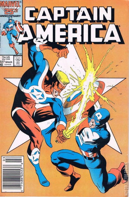 "Clashing Symbols" The Bold Urban Commandos attack foreign exchange students at the University of Wisconsin; Super-Patriot later congratulates them for threatening "terrorists." Steve comes to town to visit Bernie and investigate the Commandos' activities. Captain America tries to investigate the attacks but the police won't cooperate with him and, disturbingly, some students agree with the Commandos and think Cap endorses them. The next day, Steve and Bernie attend the AmericAid '86 concert where Super-Patriot is making an appearance alongside various popular music acts. Cap confronts Super-Patriot backstage and threatens to expose Super-Patriot's ties to the Commandos. Suoer-patriot attacks Cap to see who's better. Their battle lasts twenty-seven minutes, but despite Cap's best effort, the fight ends in a draw. Steve meets up with Bernie afterward, upset that he couldn't best Super-Patriot. In washington, a bureaucrat investigates Steve's million dollar tex return and deduces that he is Captain America.