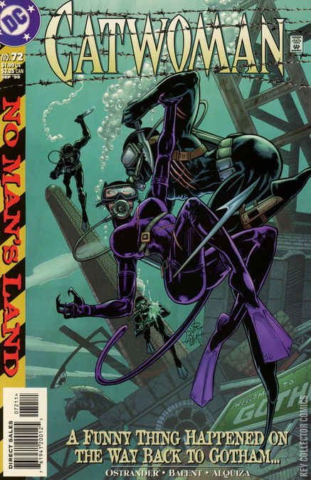 NO MAN'S LAND PART 45: THE MISSION Catwoman learns about a valuable cat-gem on display in Manhattan. She breaks into the building and manages to take the gem, but while she is looking at it, the gem transforms into a communicator and a hologram of Oracle appears. Oracle tells her that she is back in Gotham City and that "the boss" will be waiting for her in Robinson Central Station Main Lobby in twelve hours. After finishing her message, the gemstone vanishes into the air and Catwoman loses her temper. She was already on her way to Gotham when she detoured to steal the gem. Her angry outburst triggers the building's alarm and she has to move fast before the police arrive. Batman and Oracle hope that Catwoman received the message and that she will return to Gotham. Batman says she will, but after that, who knows? She's a cat. Catwoman gets out of the building but the NYPD is waiting for her. Catwoman uses her whip to grab a hold of a passing news helicopter. She forces the two reporters to take her as close to Gotham as possible. She is furious and determined to make Batman pay for what he did. In Gotham, a trio of henchmen await orders from their employer. Mercy Graves calls and tells to wait in an old steam tunnel. They are to kill anybody who walked through there as it is the only way in and out of the city that isn't blocked by the United States Government. The trio talk about their previous employers. They all agree that, after working for most of Gotham's master criminals, they would love to work for Catwoman. Meanwhile, Catwoman is already on the far side of the Gotham's shore and is planning a way to get into the city. A boat catches the attention of the army chopper patrolling above the Gotham River. The chopper spots the boat, and as they report it in, the boat explodes. Catwoman uses that as a diversion while she swims under water to reach Gotham. The U.S. Navy sends divers to look for any suspicious activity, but Catwoman manages to fool them. She reaches Gotham's shore and is shocked to see her beloved city completely destroyed. She makes it to Robinson Central Station and calls out for Batman, who appears out of the shadows. He tells her he needs her to steal some computer discs that hold vital information for restoring Gotham. The discs are in Manhattan, the very place Catwoman just left. She laughs, but she's infuriated and attacks him. Batman defends himself by saying that this conversation was too sensitive and needed to take place face-to-face and that he needed to be sure she could get in and out of Gotham before entrusting this to her. Catwoman demands to know why she should do anything for Batman. He answers, "I need you," and pulls her in for a kiss. She gives in to the kiss briefly before they pull away. Batman says he needs her help. She's the only one who can do this, the only one he can trust. Catwoman agrees, provided he find her an alternative route in and out of the city. Catwoman takes the old steam tunnel off the sewage treatment plant he recommends to her, which he believes is abandoned, but Catwoman finds herself up against the three henchman--Al, Lewis, and Mookie. They fight for a while, but when the henchman can't shoot her directly, Mookie shoots a crate of explosives. This blows the whole tunnel apart, and it floods as Catwoman and the three henchmen are dragged by the running waters.