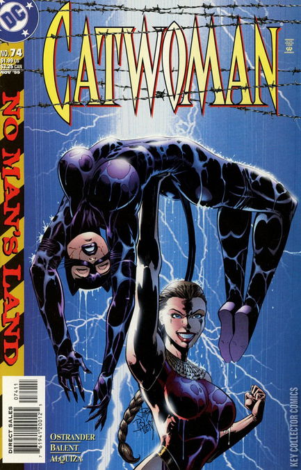 NO MAN'S LAND PART 47: A SLIGHT DETOUR Catwoman shows the stolen discs to Al and Lewis, and she refers to them as "money," items of barter that represent the ability to obtain things that are valuable. Her henchman, however, are angry with her for letting Mookie sacrifice himself. Catwoman shows them that Mookie is alive and resting in the hotel bedroom. Catwoman reveals that Mookie has a superpower--kinetic energy passes harmlessly through him. It does make him feel high, though, which is why he enjoys setting off explosions so much. In Gotham City, Oracle still can't believe Batman trusts Catwoman even after she murdered Selina Kyle. Batman knows the truth behind that story, but he doesn't tell Oracle. Instead he invents several possible scenarios in which Catwoman never killed Selina Kyle. Oracle then gets an alert that Catwoman successfully stole the discs, but she is offering them to the highest bidder on the internet. Batman isn't surprised at all. He smiles and says, "What did you expect? She's a cat." Elsewhere, while driving down the road, Mercy Graves contacts her employer and notifies him of the auction. He tells her to buy those discs at any cost. He knows the discs might be copies of the originals, but that won't matter if Catwoman is dead. Maxie Zeus is also interested the discs, and he plans to steal them from Catwoman using information his henchman Mr. Mercury has learned from his sister's second cousin, Catwoman's henchman Al. At their headquarters, the Hardcases, Inc., use their abilities to learn of Catwoman's next step. They learn that she is going to make the trade with the buyer at the top of the World Trade Center that night at midnight. Catwoman and her crew are already at the World Trade Center. She tells her crew to stay on one tower and watch a package, which she says holds the discs, while she goes to make the deal on the other tower. Al distracts Lewis by speculating he has a shot with her, even though he's already married, so only Mookie notices Maxie Zeus and his followers arrive. The Hardcases also make it there then and demand the discs in the name of their rightful owner, Bruce Wayne. A firefight breaks out. Al and Lewis take cover, but Mookie stands in between the two sides and holds up the package, saying that Catwoman told them to protect it. Conway kicks it out of his hands as the Hardcases overpower Maxie Zeus's crew. When all is said and done, the New York City Police Department apprehend everyone involved including Catwoman's crew. The Hardcases find a tape instead of the discs inside the package, and Nastacio presses 'play' and listens to a recording of Catwoman telling him he fell for her bait. The real exchange is happening in a small vehicle impound under the Brooklyn Bridge. She tells them that if everything has gone right, she's already gone, but if something goes wrong... perhaps they can catch something. Catwoman and Mercy have already exchanged the packages. Catwoman opens the case Mercy gave her, and a blast of phosphorus temporarily blinds her as Mercy aims her gun. Catwoman lashes out with her whip and manages to move Mercy's arm, saving her own life. Mercy yanks Catwoman's whip and pulls her flying through the air, then punches her when she's within arm's-reach. The Hardcases arrive and demand the stolen property. The Hardcases are no match for Mercy Graves, however, who takes them all down without breaking a sweat. Catwoman is still blinded and tries to move herself out of the way, but she is shot by Mercy and falls into the East River. Mercy jumps into her car with the discs, and she nearly mows down Nastacio when the Hardcases' leader tries to stop her. Mercy calls her employer and tells him that she has the discs, but Catwoman might have survived. Her employer tells Mercy to forget her because they have more important matters to deal with.