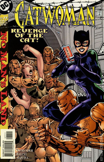 NO MAN'S LAND PART 83 - PAY BACK Catwoman plans her revenge on the people she has dealt with lately. First, she destroys the LexCorp compound using the battlesuits she stole from them. The destruction of the base forces Lex Luthor to contact the Penguin and make a deal--if Penguin returns Luthor's stolen goods and gives him Catwoman's head, then Penguin will have free reign over Gotham's underworld activities. Catwoman knew she was being used, so when Penguin tries to ambush her, she grabs Penguin by the neck with her whip and forces his henchmen to retreat. Catwoman warns Penguin to move out before she takes away his base of power too, then leaves. Penguin is shocked, but when his base begins exploding, he runs. Luthor learns of Penguin's failure, and he tells Mercy that Catwoman is her only matter of business. She will keep Catwoman from bothering him by any means necessary. Catwoman has arranged a meeting with Batman. She asks him for a favor. She wants him to contact Deadman for her, and when Batman asks why, she admits she wants payback on someone and Deadman is her means of getting it. She thanks him, but she also warns him that payback is a witch... and she's that witch. Catwoman continues her rampage against LexCorp's building bases. Eventually reconstruction stops completely because of her activities. Mercy tries her best to keep the workers in line, but they aren't happy with the results. She goes to check on Luthor, and he tells her that they're going to meet with Catwoman. Luthor hopes to reach a deal that will stop her from attacking his bases, and one of her terms before meeting him is that Mercy be present but grant her safe passage. At the meeting point, Luthor asks Catwoman what it will take to stop Catwoman from targeting his operation. She tells him all he has to do is ask, which she does, and then she adds that he say "please." Luthor hesitates, but grudgingly he speaks the word. Catwoman says that's the only thing she ever wanted and she could never say no to him. Once Catwoman leaves, Luthor tells Mercy he is very disappointed in her. Mercy hangs her head in shame. Catwoman watches her from above. She knew she couldn't take Mercy on physically, so she went after her where it hurt the most: her pride. Now, there's only a few items left to tidy up before her payback's complete. Catwoman gathers her trio of henchmen together. They are still working undercover in LexCorp, but they fear discovery. Catwoman tells them not to worry. They've already been discovered, but she gives Al and Lewis two passports and passbooks with a million dollars each in their accounts on the Cayman Islands. They're overwhelmed by her generosity, but they wonder what will happen to Mookie. She explains that she discovered how Mookie was able to stand unharmed in explosions or when hit by bullets. Mookie is dead, and he has been ever since he was working for the Joker and his boss killed him. Ever since, he has gathered kinetic energy to create enough mass to make it seem as though he were alive. Mookie says it's all true. Deadman then appears to take Mookie to the other side. Mookie wasn't sure about it, but Catwoman tells him it will be fine. Mookie goes with Deadman, and both move to the afterlife. Al and Lewis are shocked to see Mookie disappear into thin air, and Catwoman advises them to get going. She leaves too, knowing that word will get out and people will know that Catwoman takes care of her crew. She knows what she did for Mookie doesn't mesh with her reputation as a bad girl, but what did you expect? She's a cat.