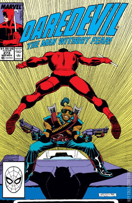 1st Printing. Cover pencils by John Romita, Jr., inks by Al Williamson. The Billion Dollar Ashtray starring Daredevil, Gorgon, Karnak, Medusa, Number Nine, Brandy Ash, Shotgun, and Skip Ash, script by Ann Nocenti, pencils by John Romita, Jr., inks by Al Williamson; Skip provides Shotgun with bigger and better weapons and sends him back out to recover number Nine from Daredevil and his daughter; Inhumans appearance Variant cover is a 1992 / 1993 J.C. Penney Marvel "Vintage Pack" reprint. All the issues in the J.C. Penney MVP set have common identifying characteristics. The most obvious is that all have a swinging Spider-Man in the UPC. There is also a blank under the issue number in the price box where the regular edition has the UK price. Secondly, the indicia clearly states Second Printing at the end. Lastly, they all have the same ads from 1992 and back cover which differ from the original printings. The back cover has an X-Men card ad with Wolverine bursting out of it.