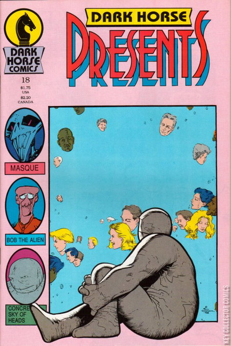Paul Chadwick's Concrete appears on the cover, and inside views another revealing episode of his favorite late-night TV show, Sky of Heads. Also inside, Mark Badger's Masque takes yet another bizarre twist, and Rich Rice's hilarious Bob the Alien (in his debut!) tries to get a date. Another "must have" issue of Dark Horse's flagship title.ChaptersConcrete's Sky of Heads: Larry's frantically completing his tax return to file before the midnight deadline. Concrete drags him away to watch the latest episode of "Sky of Heads", the TV show about the afterlife where heads eternally drift through the ether unable to do anything by briefly talk to the other heads that drift by.This weeks episode is about the value of using the time time that we have while we live.Masque: C.I.A. Agent Sullivan is becoming concerned about her partner's sanity as they continue to pursue The Mask. She's noticed Agent Corona's attitude becoming more militant as he filters events through the prism of his past in Vietnam. In the custody of those two C.I.A. Agents, Minister Doug Denton struggles with his situation and what he's seen in the past day. Alberto Montoya reveals to Doug part of the connection between himself and the masked figure at the centre of all the chaos.Bob the Alien: "Bob the Alien's First College Party." Bob's an exchange student from Venus. On of his pals on Earth takes him to a party but he hasn't quite gotten a handle on the lingo and human social interactions.