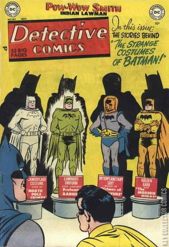 THE STRANGE COSTUMES OF BATMAN! While making an inspection of equipment in the Batcave, Bruce and Dick also inspect the various Batsuits stored in the costume room. The Dynamic Duo are later called into action and Batman uses some of his most useful Batsuits to stop the criminals. However, when he is seriously injured, Robin has to use a Batsuit that has never before being used. This costume allows Robin to disguise and pose as Batman, which proves useful in this particular situation as the criminals become overconfident after Batman's injury and are easily captured by Robin wearing the batsuit. THE MAN WHO NEVER SLEPT ONE-MAN FIRE DEPARTMENT DOVER AND CLOVER THE RIDDLE OF FORT BRAVE