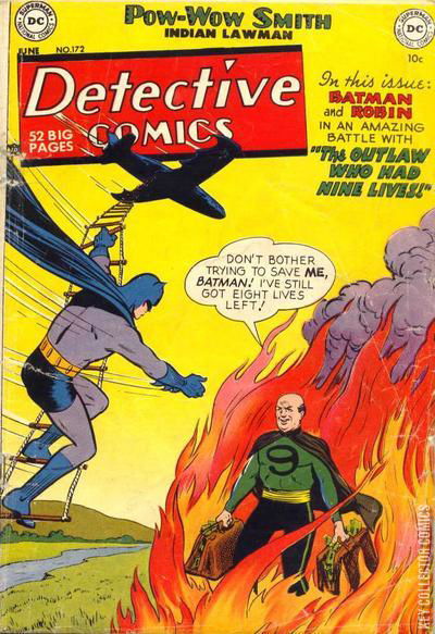 THE OUTLAW WHO HAD NINE LIVES A man called Paul Gregorian is seen dying in a plane crash, but not long after this he appears again and this time he dies when he touches some high-tension wires at the Power Plant. Next, he is seeing jumping off a bridge to a certain death. However, no matter the situation, Gregorian always manages to survive and he is dubbed the man with nine lives. Batman and Robin investigate the case and they realize that Gregorian has been using magic tricks to fool everybody. At the same time, a notorious criminal learns the same fact and he recruits Gregorian for his gang in order to perform great crimes without being captured. At first the thugs succeed, but after Batman and Robin get on their trail, they are cornered and Gregorian tries to escape by jumping off a building. The criminals are captured and the man with nine lives dies instantly. THREE CLUES TO CRIME THE HUMAN CLOCK THE PHANTOM BRAVE