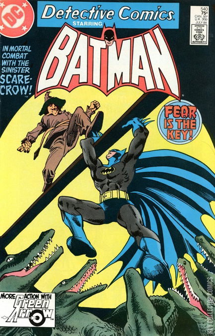SOMETHING SCARY While Batman deals with Scarecrow's fear device at the Gotham Zoo, Robin confronts the Master of Fear himself at his hideout. Both heroes struggle against the Scarecrow's well placed fear inducing devices, but Batman eventually overcomes the object and Robin finds a place to hide from Scarecrow. Once free from the grip of fear, Batman goes looking for Robin. Meanwhile, a murder attempt on Harvey Bullock takes place at the GCPD Headquarters, but the clumsy officer is saved thanks to his own incompetence. However, the killers report back to Mayor Hill and misinform him about Bullock's actual murder. Moments later, Batman arrives at the Scarecrow's hideout, where he locates Robin and they use one of Scarecrow's devices to counter the effect of the machine. Without the influence of fear, Batman and Robin are able to defeat the Scarecrow and the criminal is once again captured. IN COLD TYPE Green Arrow uses one of the Printer's Devil's fires to burn through the net, then extinguishes the fire before it can get to the gas pumps. The Printer's Devil escapes, but has a confrontation with GA the next day in front of the Star offices, and gets captured. Green Arrow unmasks the Devil, who proves to be Tommy Doyle, one of his fellow columnists. Doyle confesses that he hoped to devalue the Star through his terrorism and thus make it less valuable to Burdick. Later, Ollie Queen learns that Burdick has indeed decided not to buy the Daily Star.