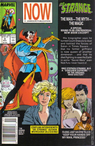 This issue contains two stories.Dr. Stephen Strange is angered by the publication in Now Magazine of an article excerpting parts of Morgana Blessing's biography of the Sorcerer Supreme. Discussing the matter with his allies, Wong, Imei, Sara Wolfe, Rintrah, and Topaz, he calms down, but he leaves to meet with Morgana. Sara reads the article.After a short introduction, the article goes into excerpts detailing major points in Strange's life: the accident that ended his medical career; his first encounters with Nightmare, Dormammu, Clea and Eternity; the death of the Ancient One and his assumption of the mantle of Sorcerer Supreme; Morgana's first meeting and subsequent relationship with Strange; the destruction of Dracula; and the apparent death and funeral of Dr. Strange.The article is followed by an interview with Morgana Blessing. In it, she emphasizes her believe that the public should know about the man who defended their world for so long.When Sara finishes, she talks with the others, expressing her regret that they declined to be more involved with Morgan's book. They then ponder the ramifications of the revelation of Strange's secrets, as, outside the Sanctum Sanctorum, a crowd of newly-devoted fans gather.Also, included is a J. Jonah Jameson editorial disavowing the veracity of the article and the book.Back-up feature: "The Book of the Vishanti -- The Curse of the Darkhold, Part 1: 'The Montesi Formula' " - Dr. Strange reads from the Book of the Vishanti about the recent history of the Darkhold: the book coming into the hands of Jack Russell (the Werewolf), then Father Damon Joquez, Dracula, Morgan Le Fey, Modred and Chthon; the discovery of the Monresi formula, and its use to eradicate all vampires; and the defeat of would-be Sorcerer Supreme, the alien Urthona.