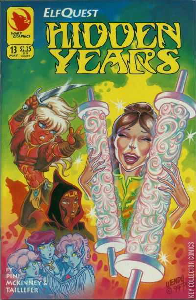 ElfQuest: Hidden Years #13 is called "Shards Part 4", which implies that there are actually 21 issues of ElfQuest: Shards: five in the Hidden Years series (numbers 10-14) and sixteen in all of the Shards offshoot where Cutter and Rayek join forces to unite the disintegrated Palace of The High-Ones.Winnowill who has morphed a fourth finger and become "Lady Venovel" finally seduces the Grohmul Djun in his tent. His troupe has found the Scroll of Colors. The Djun is very hateful of this woman, and when he accosts her, she gives him the touch of death (false-healing) against his wrist.As a show, she offers herself to be slaughtered on her knees, but the Djun cannot behead her, instead is seduced in a wave of passion, deciding to build a great citadel, assisted by her son Two-Edge.