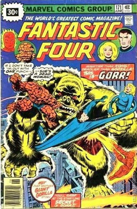 DEATH IS A GOLDEN GORILLA! In order to find out the limits of Ben's new Thing exo-suit, by having him beat up a specially prepared Life Model Decoy. Ben knocks the creature out surprising Reed who only figured that the suit would make Ben as strong as Power Man but it turns out that the suit is just as strong as his old form. Ben, however, can do nothing but complain before taking the suit off and going to take a shower. After his shower, Ben realizes that he is growing insecure as he used to be the strongest man on Earth until Thor, and other super-strong heroes began turning up. Walking through the Baxter Building, Ben happens upon Sue in the middle of a training session and finds that even Sue's powers are getting stronger. Talking about the benefits of being human again, Sue points out that Alicia is really enjoying taking care of Franklin and suggests that perhaps Alicia is becoming interested in being a mother. Meanwhile, Johnny Storm has managed to convince his new love interest Frankie Raye to go out on another date to the Central Park Zoo. When asking her why she fled when he fought the Crusader as the Human Torch, however, Frankie can't explain her fear. They are interrupted by the sound of an alien craft that suddenly passes overhead. When the ship lands the police arrive and surround it. From inside the ship emerges a golden gorilla, and once exiting the ship the ape begins to grow in size. Instinctively, Johnny flames on to go into action at the Torch until he realizes that Frankie is horrified and goes back to her. The police cannot stop the ape and it goes a rampage across the city, ending up at the Baxter Building, where it smashes its fist through the wall and grabbing Sue before climbing up to the roof of the building. Reed and Ben rush to the Fantsti-Car to fly up to the roof and attack the golden ape that has nabbed Sue. Their attacks are ineffective and the beast easily fights them off. At Frankie's apartment, Johnny hears a radio report about the golden gorilla's attack on the Baxter Building and cannot stay on the sidelines any long and rushes off to rescue his family, leaving Frankie behind in tears. When Johnny arrives, his flame powers frighten the creature, however he throws Ben at him, knocking both out of the sky, prompting Reed to break off his attack and save them. Sue manages to break free by putting an invisible force field between her and the ape's grip freeing herself from its grasp and getting to safety. On Reed's orders, Sue puts an invisible force field around the giant ape, cutting off its air until it passes out. As the ape falls off the roof of the Baxter Building it begins to reduce in size, and is saved from a fatal fall by the Human Torch. Taking the creature inside and restraining it, Reed and the others are shocked to find that the ape can talk. Introducing itself as Gorr, the ape tells them that he has travelled 200,000 miles to Earth to seek out the Fantastic Four's aid in stopping Galactus.