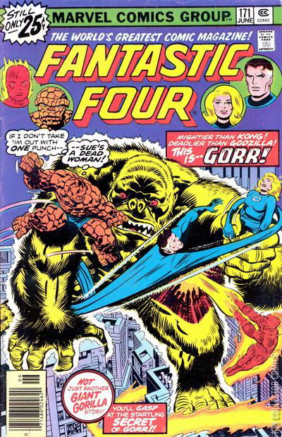 DEATH IS A GOLDEN GORILLA! In order to find out the limits of Ben's new Thing exo-suit, by having him beat up a specially prepared Life Model Decoy. Ben knocks the creature out surprising Reed who only figured that the suit would make Ben as strong as Power Man but it turns out that the suit is just as strong as his old form. Ben, however, can do nothing but complain before taking the suit off and going to take a shower. After his shower, Ben realizes that he is growing insecure as he used to be the strongest man on Earth until Thor, and other super-strong heroes began turning up. Walking through the Baxter Building, Ben happens upon Sue in the middle of a training session and finds that even Sue's powers are getting stronger. Talking about the benefits of being human again, Sue points out that Alicia is really enjoying taking care of Franklin and suggests that perhaps Alicia is becoming interested in being a mother. Meanwhile, Johnny Storm has managed to convince his new love interest Frankie Raye to go out on another date to the Central Park Zoo. When asking her why she fled when he fought the Crusader as the Human Torch, however, Frankie can't explain her fear. They are interrupted by the sound of an alien craft that suddenly passes overhead. When the ship lands the police arrive and surround it. From inside the ship emerges a golden gorilla, and once exiting the ship the ape begins to grow in size. Instinctively, Johnny flames on to go into action at the Torch until he realizes that Frankie is horrified and goes back to her. The police cannot stop the ape and it goes a rampage across the city, ending up at the Baxter Building, where it smashes its fist through the wall and grabbing Sue before climbing up to the roof of the building. Reed and Ben rush to the Fantsti-Car to fly up to the roof and attack the golden ape that has nabbed Sue. Their attacks are ineffective and the beast easily fights them off. At Frankie's apartment, Johnny hears a radio report about the golden gorilla's attack on the Baxter Building and cannot stay on the sidelines any long and rushes off to rescue his family, leaving Frankie behind in tears. When Johnny arrives, his flame powers frighten the creature, however he throws Ben at him, knocking both out of the sky, prompting Reed to break off his attack and save them. Sue manages to break free by putting an invisible force field between her and the ape's grip freeing herself from its grasp and getting to safety. On Reed's orders, Sue puts an invisible force field around the giant ape, cutting off its air until it passes out. As the ape falls off the roof of the Baxter Building it begins to reduce in size, and is saved from a fatal fall by the Human Torch. Taking the creature inside and restraining it, Reed and the others are shocked to find that the ape can talk. Introducing itself as Gorr, the ape tells them that he has travelled 200,000 miles to Earth to seek out the Fantastic Four's aid in stopping Galactus.