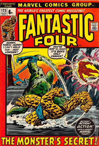 THE MONSTER'S SECRET! Trapped in a flooding cave, Sue Richards is at the risk of drowning. As the cavern fills with water she attempts a desperate gamble: enveloping herself in an invisible force field she hopes that she has enough air for the water currents to push her to the surface. Meanwhile, at a hospital, Reed tries to struggle free from the doctors that are trying to get him to rest after suffering from extreme exhaustion. Seeking to break free and search for his missing wife, Reed struggles with hospital staff until they are able to sedate him.�� At the Baxter Building, Johnny and Ben have gone through the Fantastic Four's files and discovered the identity of Sue's kidnapper, the so-called Creature of the Lost Lagoon. The pair recall how they originally encountered the alien not so long ago and, after a misunderstanding, the creature ventured off into space with its mate and unborn children.� �Ben and Johnny wonder what the creature is doing back on Earth, and why it kidnapped Sue.�� Back in the underwater cave, Sue is still trapped and is quickly running out of air, when the creature suddenly finds her. Realizing that she is in grave danger, Sue's kidnapper plugs the floor and the cavern begins to drain of the flood water. This allows Sue to drop her force field, but she is left to wonder why the alien has captured her and what it could possibly want from her. While at the hospital, Reed shakes off the effects of the sedative and more determined than ever to rescue his wife manages to put on his costume and force his way out. Reed only gets as far as the roof before he is struck with another wave of fatigue. But when the hospital staff surrounds him, Reed allows himself to fall off the roof and turns his body into a glider to float away.�� Meanwhile, at the Baxter Building, Johnny recalls that the lost the creature near a lake in Central Park and goes for some diving gear. As the Torch rockets off on his own, Ben tries to follow after him in the Pogo Plane only to realize that it does not have any fuel. Rushing down to the parking garage, the Thing then lifts Johnny's sports car out of its parking space and speeds off to the park as well. At that very moment, Reed spots Johnny in the distance and also begins floating to their intended destination. When they all arrive minutes apart from each other, Reed tires to go off after his wife alone, but is held back by both Ben and Johnny. When Reed refuses to stand down, Ben is forced to knock their leader out. While Johnny and Ben dive into the lake, the creature brings Sue aboard his ship, then abruptly leaves her alone with more questions.�� Swimming to the outer lake, the creature crosses paths with Ben and Johnny. When the Creature fights back, the Torch uses his powers to heat up the water and force the creature to the surface. There Ben and Johnny pile onto their attacker, but soon Reed gets into the middle of their battle, pointing out that the creature has come for help, not to fight. Convincing the creature that they mean no harm, it brings them to its ship where it reveals that Sue is unharmed. She explains that the creature returned to Earth to get medicine when his mate contracted an illness from their last time on Earth, and desperate for aid, it kidnapped Sue for help. With the explanations out of the way and the creature's mate cured, both aliens blast off in their ship, leaving the Fantastic Four behind.