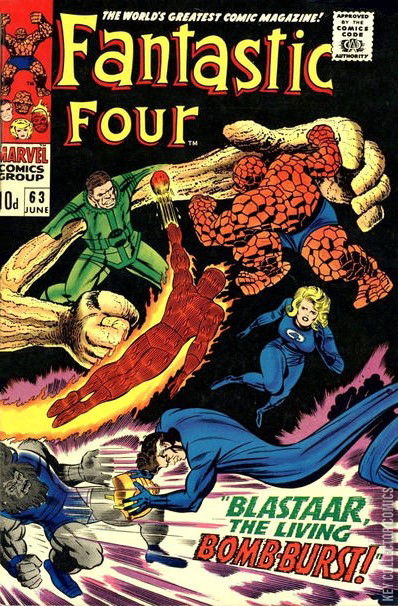 BLASTAAR, THE LIVING BOMB-BURST! After rescuing Reed Richards from the Negative Zone, the Fantastic Four and their ally Triton are attacked by Blastaar -- a being who escaped from the Negative Zone -- and the Sandman. When Reed tries to counterattack he is knocked back, leaving the way open for Triton to enter the fray. Although he gets the drop on Blastaar, Triton is weakened when blasted by the Sandman's moisture robbing sand, and is knocked out. Sandman then grabs Blastaar and takes him down to the street where they begin wreaking havoc upon the people below. Down on the street are the Human Torch and Crystal who are about to go on a date when they see the panicked crowd and decide to go back to the Baxter Building to investigate. Sandman and Blastaar's rampage attract the police who try to incapacitate Sandman with a cement gun, but he is freed by Blastaar's bomb busts. Sandman begins to question his choice in partner when he realizes that Blastaar is drunk with power. However he is not given time to reconsider since both the Human Torch and the Thing arrive on the scene and begin battling it out with their foes. While inside the Baxter Building, Mister Fantastic and the Invisible Girl get Triton to a water tank to replenish his strength. Watching video of the battle below, Mister Fantastic then begins working on a device to stop Blastaar. As the battle rages on, Blastaar attempts to take Crystal as a hostage, but learns that that is a mistake when she unleashes her elemental powers upon him. Furious that Blastaar attacked his girlfriend, the Human Torch begins unleashing his full power on Blastaar, who is able to withstand the extreme heat. Meanwhile, the Thing and Sandman continue to tussle until their battle takes them to the docks. The struggle ends when the Thing dumps the Sandman into the water. Defeated, the Sandman allows his body to dissipate in the water in order to escape. Just then, Reed and Sue enter the battle, and while the rest of the Fantastic Four keep Blastaar occupied, Reed manages to clamp on a helmet he invented to incapacitate their foe, ending the battle.