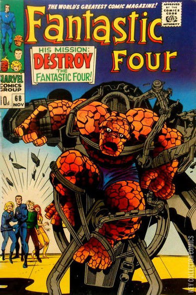 HIS MISSION: DESTROY THE FANTASTIC FOUR! The Fantastic Four pay a visit to Alicia, who has been hospitalized after her encounter with the scientists of the Beehive. The tender moment between Ben and Alicia is soured when Ben implies that he is taking advantage of her blindness as a selfish means of dating her. Reed gets Ben out of the hospital room and asks him what is wrong. Ben admits that he has doubts that Alicia would remain with him if she ever got her eyesight back and saw what he really looked like as the Thing. When Reed tries to reassure Ben that Alicia truly loves him, Ben finds it hard to believe and begs Reed to find a way to restore him to normal. At that very moment the chemist Doctor Santini has been captured by a mysterious man who exposes Santini to his hypno-lenses. Demanding to know what Reed Richards had hired him for, the man learns that Santini was sought out to help try and find a cure for the Thing's condition. This gives their mysterious enemy just the right avenue to get revenge against his hated foes. While back at the Baxter Building, Reed conducts another test on Ben's body in his ongoing quest to try and find a means to cure his friend. He tells Ben that with the help of Doctor Santini he may be able to create a cure that will be permanent this time around. As they exit Reed's lab, they walk in on Sue trying on her new modified costume that has a mini-skirt. When she is spotted she is embarrassed and tries to turn invisible. This turns into a playful chase between husband and wife. When Reed wraps himself around his wife, Ben helps her out by blowing so hard that Reed is thrown off of her. This makes Reed happy since it appears that Ben is acting like his old self again. At that moment at a nearby garage, Johnny shows off his girlfriend Crystal to his friends. When they begin hitting on Crystal, Johnny reacts poorly by giving one of his friends a literal hot foot. Upset by Johnny's immaturity, she summons up a whirlwind with her elemental powers to shake things up a bit. As Ben, Reed and Sue have some fun, their mysterious foe completes his disguise so that he looks identical to Doctor Santini and prepares to enact his plan of revenge against the Fantastic Four. Back at their headquarters, Ben puts on his best suit for their guest, but it bursts at the seams because he was holding his breath to put it on. When "Doctor Santini" arrives, he is introduced to Ben. After seeing a display of the Thing's power, "Santini" promises that after this experiment Ben will be an entirely different person. Reed begins to work with "Santini" on a possible cure. Meanwhile, Ben has gone for a walk and is so lost in thought, he is oblivious when members of the Yancy Street Gang manage to knock off his hat with a shot from a slingshot. As the two scientists complete their work, they believe they have some sort of success. Although she doesn't voice her concerns, Sue has come to mistrust "Doctor Santini" but cannot explain why. When Ben returns he is excited to get the experiment under way hoping it will cure him. First Ben goes into a chemical bath and then is bombarded with mesa rays. Finally Ben is strapped into a "molecul-board" for a final bombardment of energy. When "Santini" announces an unexpected adjustment, Reed tries to stop him but he is too late. When the beam hits Ben it doesn't change him back to normal, it only affects his personality. Filled with a total rage, the Thing blames Reed for failing to restore him to normal yet again, this time fully prepared to kill his best friend.
