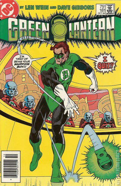 Take This Job and Shove It." Hal "Green Lantern" Jordan turns in his ring. Meanwhile, the Predator kills Jason Bloch. Script by Len Wein, pencils by Dave Gibbons, inks by Mark Farmer. "One Night in a Bar on Lawrel-Hardee XI." Ch'p encounters space pirates in a bar on an alien world in this Tales of the Green Lantern Corps backup story. Script by Paul Kupperberg, art by Don Newton. Cover by Gibbons.
