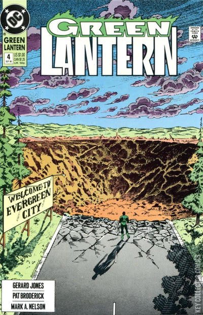 Hal decides to investigate the sudden disappearances of two entire towns. Meanwhile, John Stewart plans to escape his malevolent tormentor, even if it costs him his life. "Among my Souvenirs!" Part 4 of 8. Guest-starring Green Lantern (Guy Gardner) and Green Lantern (John Stewart). Justice League cameo.Hal Jordan has gotten a job in California as a peach picker and life couldn't be more complete, but unknown to him, Appa Ali Apsa is stealing cities that he has been to. His latest being is Evergreen City. Later after having a conversation with Clay about running from things you believe own you Hal decides not to charge his ring anymore and just be a normal person. That night Hal has a nightmare where John Stewart is telling him to protect the cities but all Hal can do is pick peaches.When Hal wakes up Clay tells him about the missing cities and Hal realizes the next town will be Hope Springs and flies there to stop it from being taken. When he gets there he is too late and it is gone. Hal knowing what to do charges his ring, by using the oath he hasn't said in months and flies off to Oa to stop the Mad Guardian.
